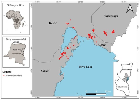Surveys were conducted in the Eastern part of the DRC, focusing on vegetable-growing areas surrounding Goma (1°41′01″ S, 29°14′07″ E, 1502.09 m altitude), the capital of the North-Kivu province. Besides the peri-urban areas of Goma city, three administrative territories across two provinces were covered. In North-Kivu province, the Nyiragongo and Masisi territories were surveyed, while in South-Kivu province, the Kalehe territory was surveyed (Figure 1). In DRC, a “territory” is a second-level administrative division under a province. The selected areas are the leading suppliers of market garden produce, including Brassica crops, to Goma. A tropical Afro-mountain climate dominates this high-altitude region. It is characterized by mild temperate conditions with a correlation between temperature and elevation, and the area is endowed with rich volcanic soil [39], making it ideal for growing cabbage. Most of the population in the regions surveyed relies on small-scale agriculture and livestock farming, fishing, and informal trade. The main grown cruciferous vegetables are cabbage and cauliflower.