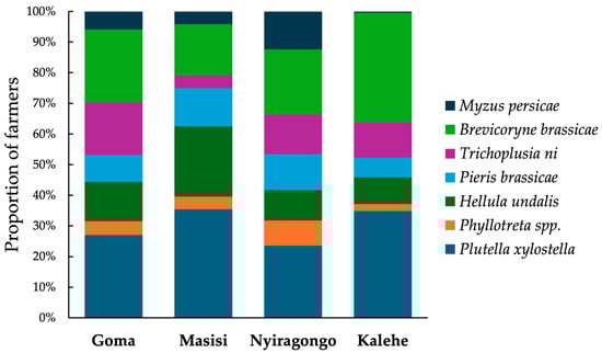 Seven pests were highlighted by farmers as the most dominant, namely: Plutella xylostella, Brevicoryne brassicae, Trichoplusia ni, Hellula undalis, Pieris brassicae, Myzus persicae, and Phyllotreta spp. (Figure 2). The DBM (P. xylostella) was the most frequently cited pest overall (28.9%), with high proportions in Masisi (35.4%), Kalehe (34.9%), and Goma (27.1%). The cabbage aphid (B. brassicae) was also highly prevalent in Kalehe (35.7%) and Goma (23.6%), resulting in the second-highest average perception rate across all territories (27.0%). The cabbage looper (T. ni), the cabbage webworm (H. undalis), and the white butterfly (P. brassicae) were moderately cited, with ± average values of 12.8%, 10.4% and 9.3%, respectively. T. ni had a high perception rate in Goma (17.2%) and Nyiragongo (12.9%). H. undalis was notably mentioned in Masisi (22.9%), while P. brassicae had moderate perception across all zones, ranging from 6.4% in Kalehe to 12.5% in Masisi. M. persicae and Phyllotreta spp. had lower overall frequencies (6.5 and 5.2%, respectively), though the green aphid was more prevalent in Nyiragongo (12.3%). Other cabbage pests occasionally reported include cutworms (Agrotis spp.) and millipedes.