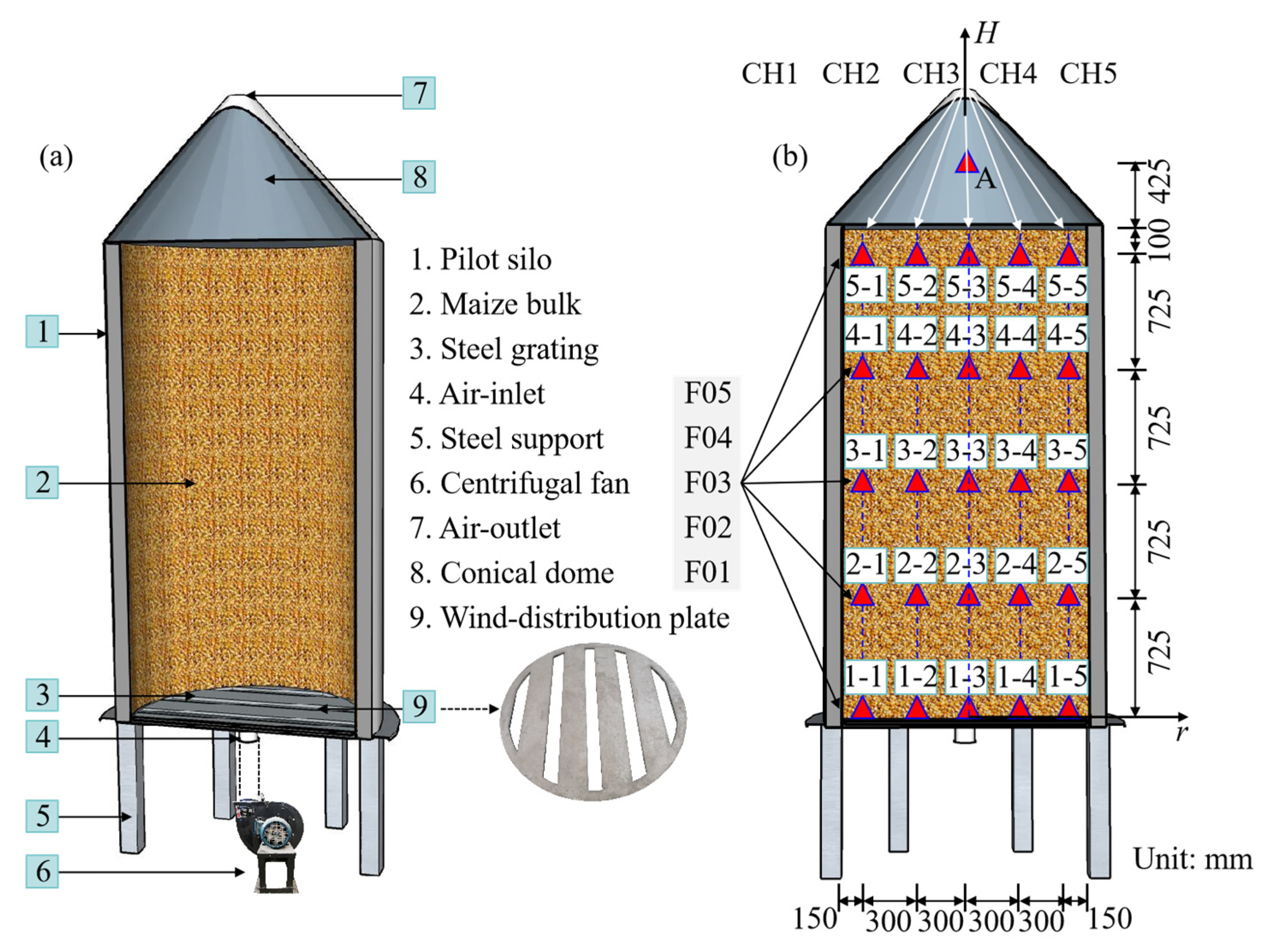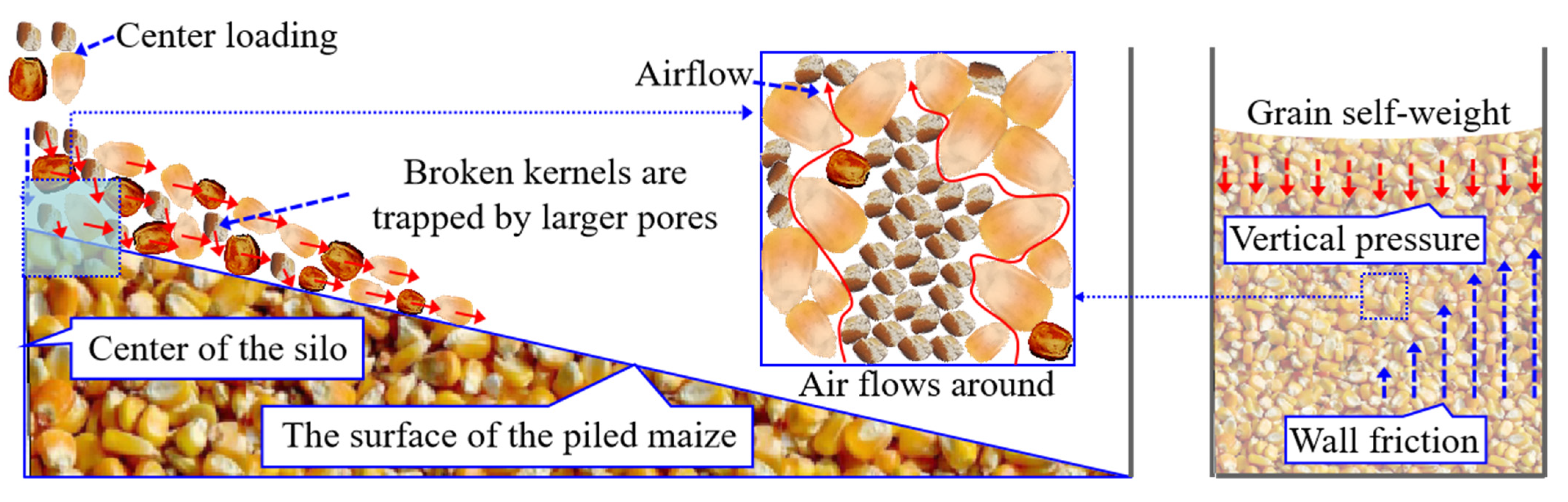 - Chen, G.X.; Liu, C.S.; Zheng, D.Q.; Wang, D.X. Segregation of particles during maize loading process in a center loaded silo. Sci. Rep. 2025, 15, 9090. [Google Scholar] [CrossRef]