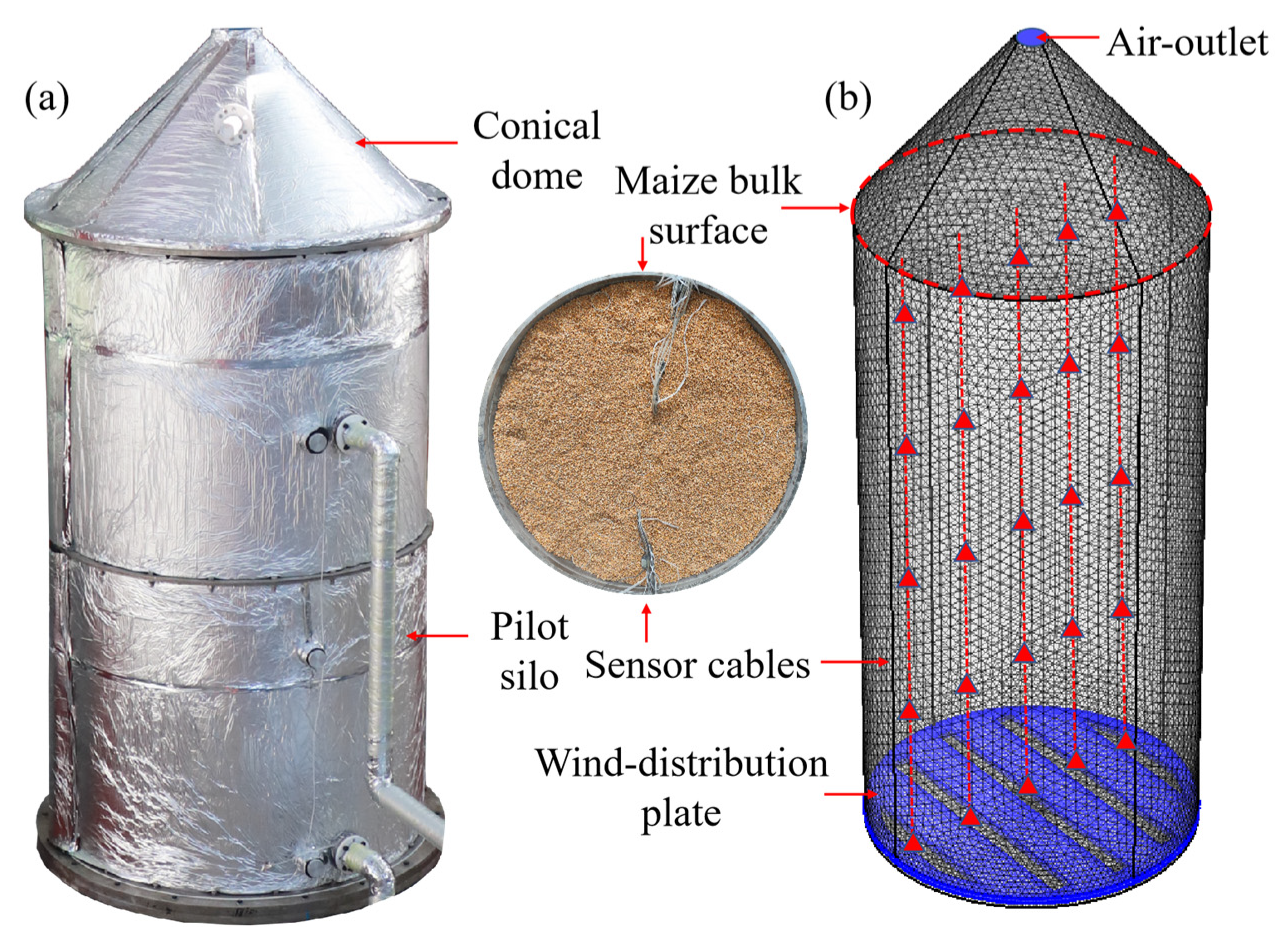 - Lawrence, J.; Maier, D.E. Three-dimensional airflow distribution in a maize silo with peaked, levelled and cored grain mass configurations. Biosyst. Eng. 2011, 110, 321–329. [Google Scholar] [CrossRef]