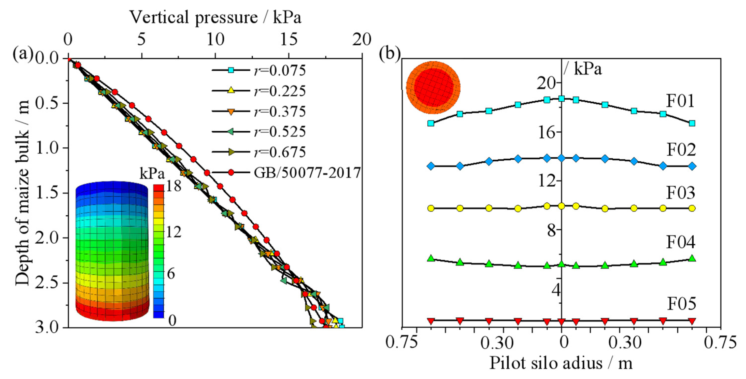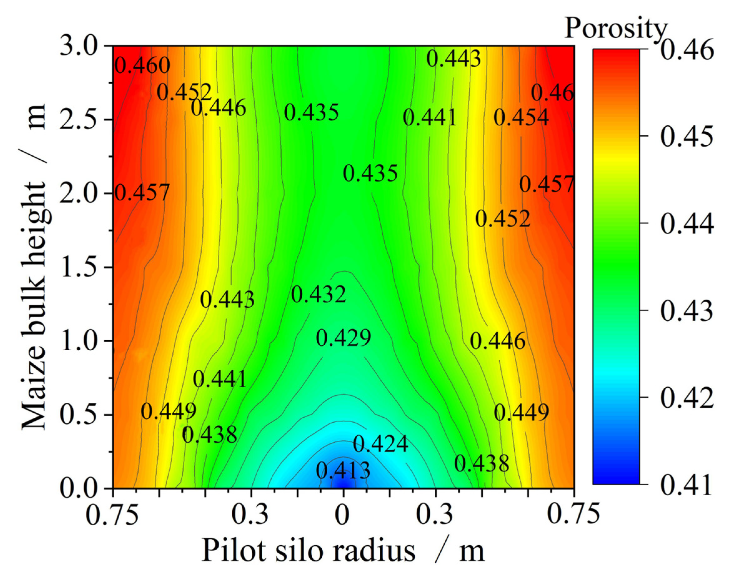 - The vertical pressure within the maize bulk decreases nonlinearly from the silo wall toward the center, and this non-uniformity becomes more pronounced with increasing depth. The self-weight of the grain compacts the lower layers, resulting in a 2.8% higher average porosity at the surface compared to the bottom of the silo.