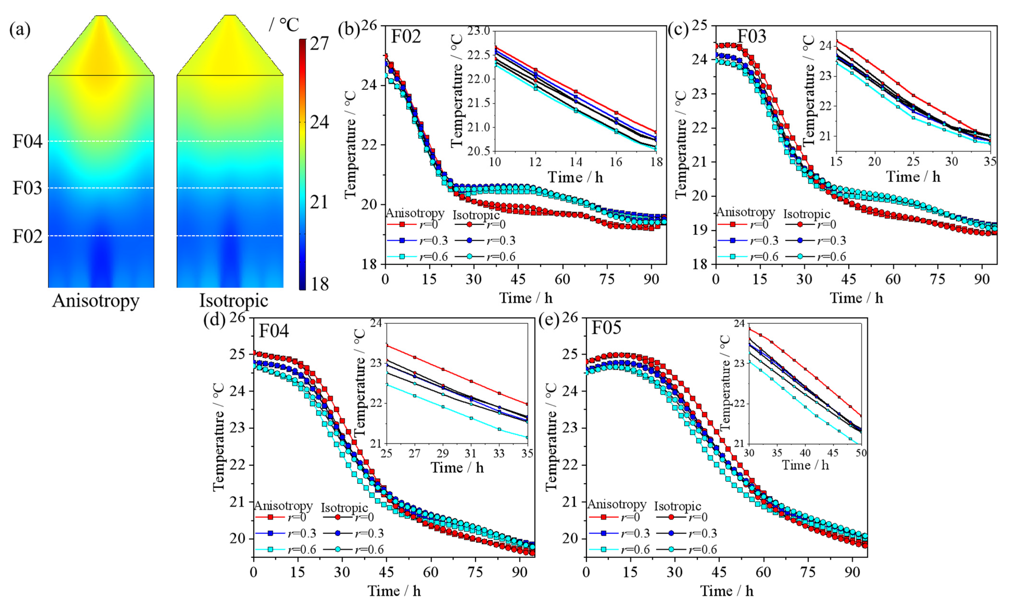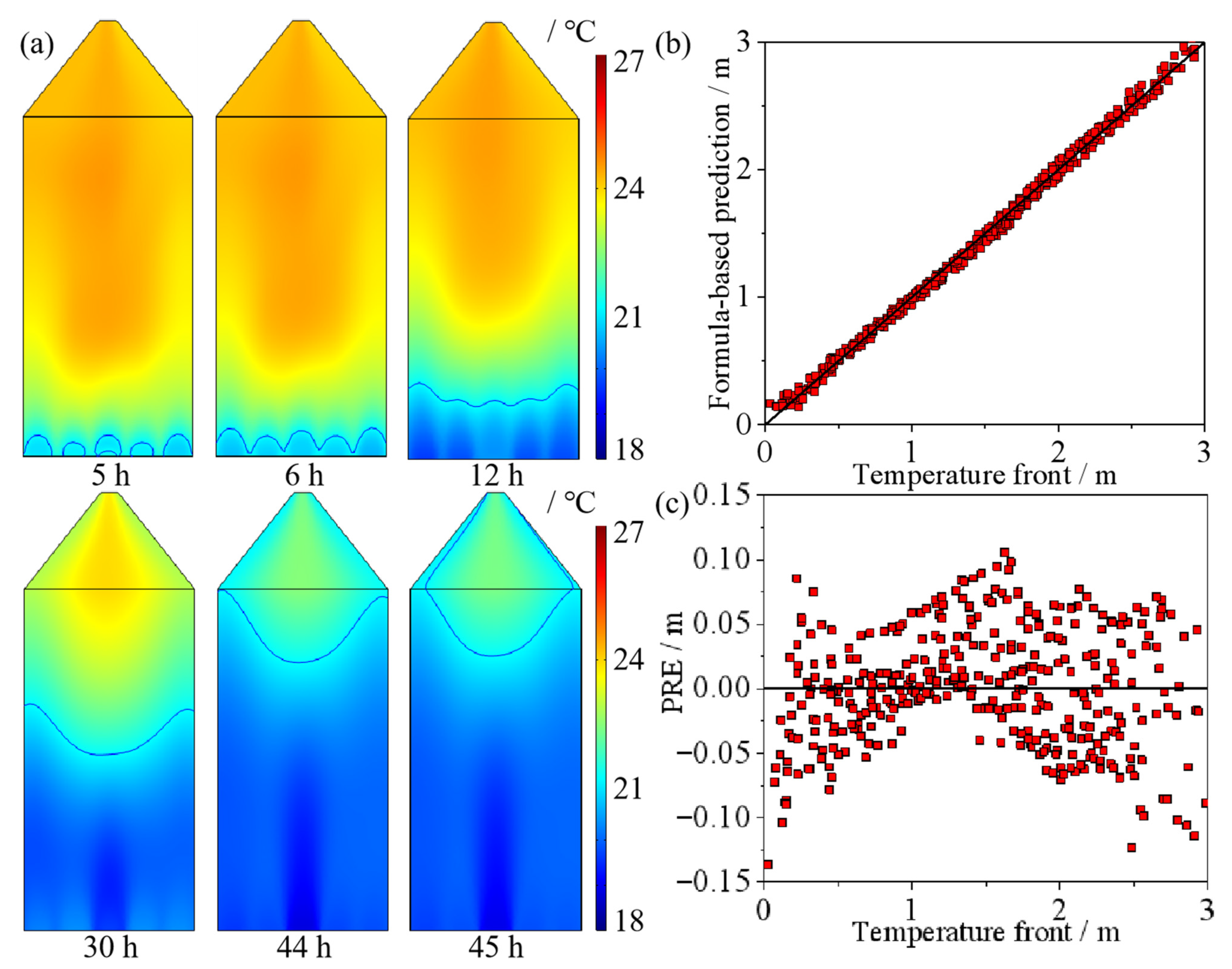 - The temperature front during ventilation based on the anisotropic porosity model exhibits a concave curve. A nonlinear model was developed to predict this temperature front during maize bulk ventilation, which shows strong agreement with computational data. The findings are positioned to provide theoretical insight and technical guidance for optimizing grain storage ventilation strategies and predicting cooling front dynamics.