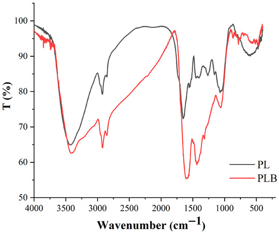 Fourier-transform infrared spectroscopy (FTIR) was used to identify all IR-active functional groups of PL and PLB. Spectra were recorded using a Thermo Scientific Nicolet iS50 spectrometer in transmission mode. Each sample was mixed with potassium bromide (0.8 mg of sample with 80 mg of KBr) and pressed into transparent pellets. The spectral range was set from 4000 to 400 cm−1 with 64 scans per sample at a resolution of 2 cm−1.