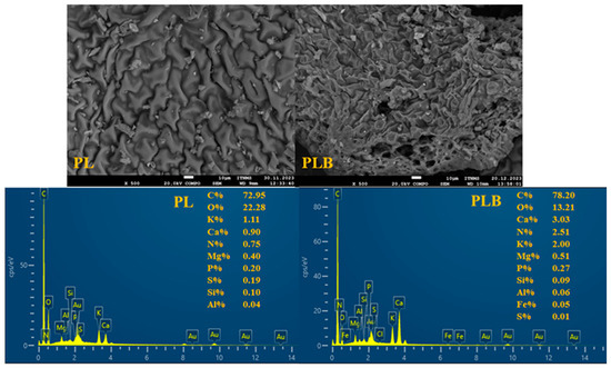 In order to confirm structural changes during pyrolysis, a SEM/EDX analysis of the samples was additionally performed on both the raw biomass (PL) and biochar (PLB) samples. As shown in Figure 3, the surface morphology of PLB exhibited a significant structural transformation compared to PL. The raw biomass exhibited a relatively smooth and compact surface, whereas the PLB surface revealed a heterogeneous architecture with newly formed pores, cracks, and irregular cavities. These features are characteristic of thermally decomposed lignocellulosic material and are commonly associated with enhanced porosity and increased surface area. Such porous and channel-rich structures are advantageous for various agronomic and environmental applications, including their use as soil conditioners, adsorbents, and nutrient carriers [48,49]. The enhanced surface topography of PLB facilitates water retention, improves soil aeration, and promotes nutrient exchange, thereby increasing the bioavailability of essential elements to plants and improving overall soil quality.