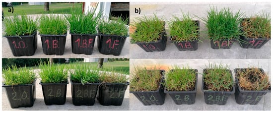 Visual assessments at the end of the month (Figure 4a) revealed noticeable differences in turfgrass development among treatments. Samples 1.0 (control), 1.B (biochar only), and 2.0 (control under limited irrigation) exhibited relatively dense growth with fine textured blades. In contrast, sample 2.F (fertilizer under limited irrigation) appeared sparser, with thinner and softer leaves, indicating signs of drought stress. This observation is consistent with previous findings where excessive nitrogen application under drought conditions was shown to exacerbate osmotic stress and reduce plant resilience, leading to visible symptoms such as thinner leaves and dry tips [45]. The combined treatment of biochar and fertilizer (1.BF) promoted vigorous growth, resulting in lush, dark green turf with elongated, healthy leaves. Although the 2.BF sample (biochar + fertilizer under reduced irrigation) showed a slightly reduced density compared to 1.BF, its turfgrass maintained a visibly healthier appearance than treatments with fertilizer alone. Notably, both fertilizer only treatments (1.F and 2.F) demonstrated signs of nutrient or moisture imbalance, such as shorter leaves and dry tips. These results suggest a potential antagonistic interaction between nitrogen fertilization and limited water availability when biochar is not present. Previous studies have shown that biochar can mitigate such imbalances by improving nutrient-use efficiency and reducing nitrogen leaching [50,51]. These visual symptoms suggest that biochar addition may have improved soil properties and nutrient availability for plant growth, particularly under conditions of limited irrigation.