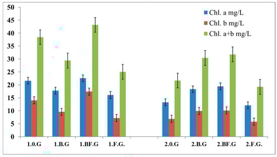 According to the results obtained in this study, the chlorophyll content in grass samples treated with biofertilizer either alone (B.G) or in combination with mineral fertilizer (BF.G) was relatively high and stable compared to untreated controls (Figure 6). The BF treatment consistently showed the highest total chlorophyll concentration, with sample 1.BF.G reaching 43.17 ± 0.43 mg/L and sample 2.BF.G reaching 31.79 ± 0.22 mg/L, indicating enhanced photosynthetic activity and improved plant vigor. This suggests that the synergistic effect of biofertilizer and mineral nutrients promotes pigment biosynthesis, likely through improved nutrient availability and microbial stimulation in the rhizosphere. In both series, biofertilizer alone (B) also positively influenced chlorophyll content (1.B.G: 29.41 ± 0.11 mg/L; 2.B.G: 30.41 ± 0.41 mg/L), performing significantly better than the fertilizer-only treatments (1.F.G: 25.05 ± 0.052 mg/L; 2.F.G: 19.23 ± 0.80 mg/L) and in some cases even outperforming the untreated control. Interestingly, F treatments (mineral fertilizer alone) yielded the lowest chlorophyll concentrations in both series most notably in 2.F.G, where total chlorophyll dropped below the level of the control (2.0.G), suggesting limited efficiency when used without biological supplementation. When comparing the two series, series 1 generally had higher chlorophyll values across all treatments, indicating that growth conditions or environmental factors in that series may have further supported pigment accumulation. However, the relative trends remained consistent across both series: BF > B > F > control, supporting the robustness of the biofertilizer effect.