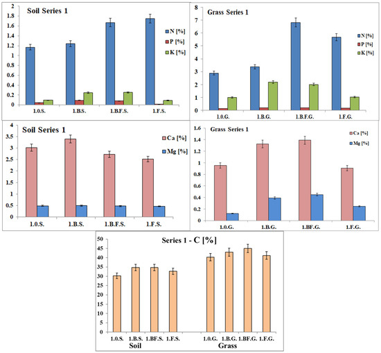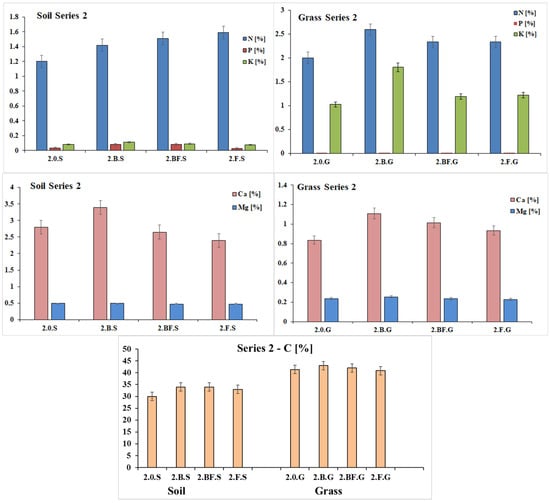 Following the turfgrass cultivation period, collected residual growing medium and plant samples were prepared for inorganic analysis using standardized acid digestion procedures. Residual growing medium samples (1.0S, 1.BS, 1.BFS, 1.FS, 2.0S, 2.BS, 2.BFS and 2.FS) were digested via wet mineralization using aqua regia (HCl:HNO3 = 3:1 v/v) under controlled heating to extract inorganic elements, in accordance with established protocols for soil elemental analysis [22]. Dried plant tissues (Grass-1.0G, 1.BG, 1.BFG, 1.FG, 2.0G, 2.BG, 2.BFG and 2.FG) were digested using microwave-assisted acid digestion (Ethos Up, Milestone) with concentrated nitric acid (HNO3) and hydrogen peroxide (H2O2), following the official protocol for agricultural plant material (Agriculture, Dried Plant Tissue). The prepared solutions were subsequently analyzed to determine the concentrations of macronutrients. Although the digestion procedures applied may not fully decompose silicate-bound fractions, they are sufficient for determining the pseudo-total concentrations of elements, in accordance with standardized protocols widely accepted for soil and plant analysis [17,18]. For soils and plant samples, the analysis of inorganic elements, pH value, and total elemental composition (C, H, N, S) was performed using the same analytical instruments and procedures previously described in Section 2.2. These included atomic absorption spectroscopy (AAS), atomic emission spectroscopy, UV-Vis spectrophotometry for phosphorus, and CHNS-O elemental analysis.