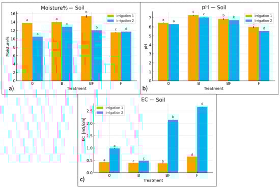 Effects of biochar (B), fertilizer (F), and their combination (BF) on residual growing medium parameters: (a) moisture content, (b) pH, and (c) electrical conductivity (EC), under two irrigation regimes (Irrigation 1 = regular; Irrigation 2 = reduced). Different letters indicate significant differences among treatments within the same irrigation regime (Tukey HSD, p < 0.05).