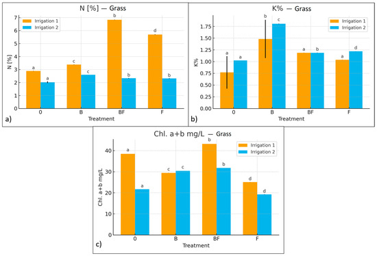 Effects of biochar (B), fertilizer (F), and their combination (BF) on (a) turfgrass nitrogen content, (b) turfgrass potassium content and (c) total chlorophyll (a + b), under two irrigation regimes (Irrigation 1 = regular; Irrigation 2 = reduced). Different letters indicate significant differences among treatments within the same irrigation regime (Tukey HSD, p < 0.05).