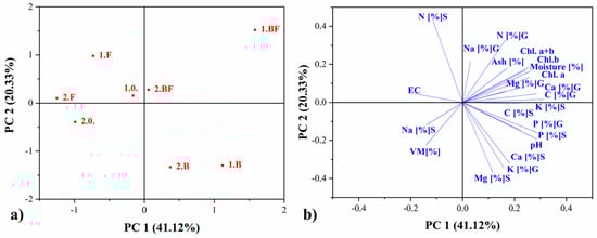 PCA analysis of growing medium and grass data revealed a clear separation of treatments according to biochar content (Figure 11). PC1 explained most of the variance, distinguishing biochar containing samples (B and BF) on the positive side from controls and fertilizer only treatments (1.0, 2.0, 1.F, and 2.F) on the negative side. PC2 reflected the effect of fertilizer application, with nitrogen enriched samples located on its positive side. In Figure 11b, biochar treatments were separated mainly by plant nutrient content, chlorophyll concentration, pH, moisture, and most soil nutrients. Other treatments were distinguished primarily by EC values and the contents of volatile matter, Na, and N in the soil. These results indicate that biochar application induced significant shifts in growing medium composition and plant nutrient uptake, as visualized by PCA.