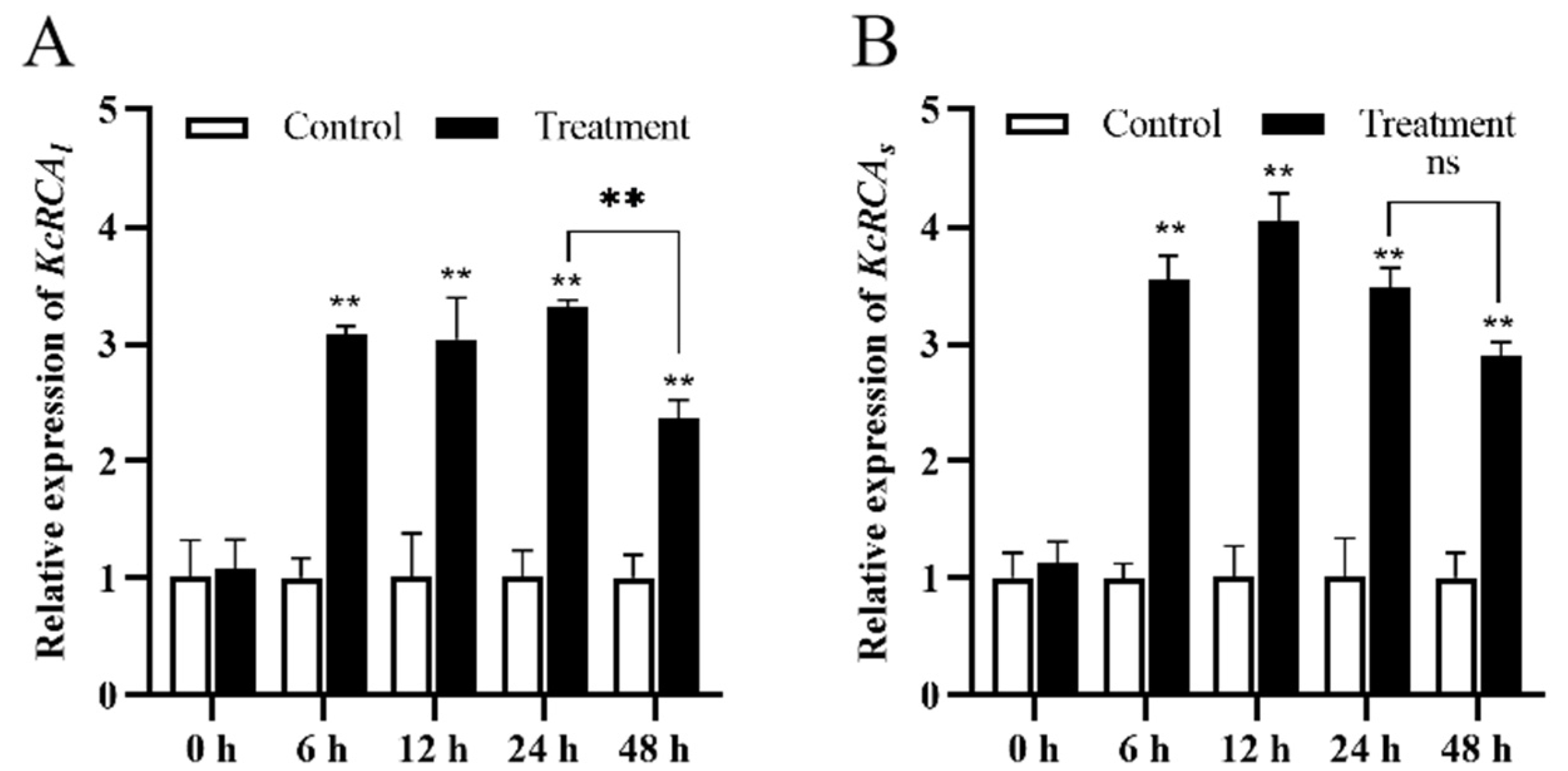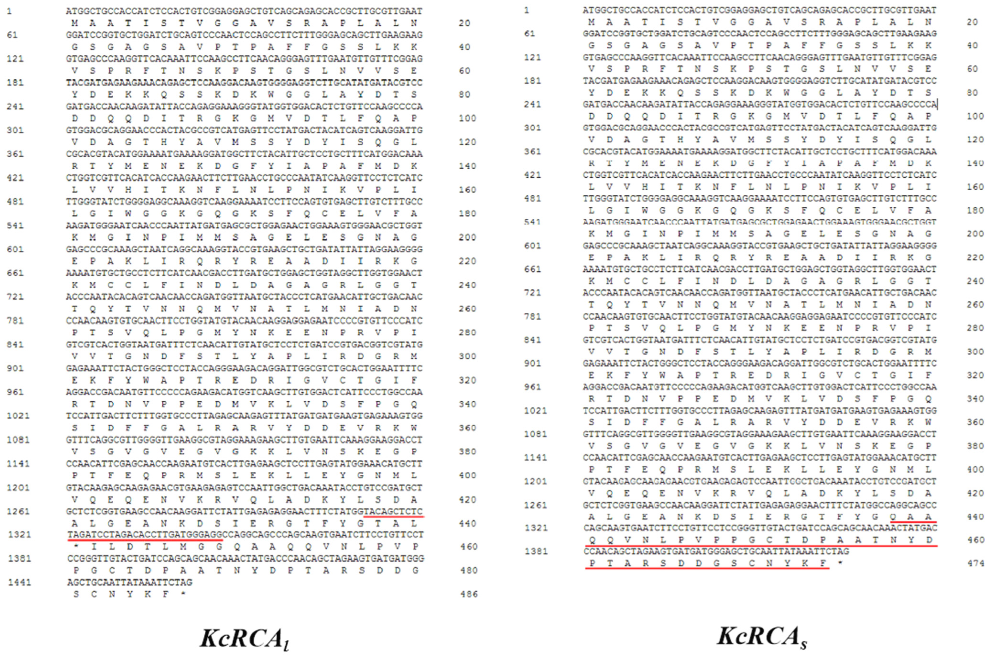 3.1. Isolation and Characterization of Two Distinct RCA cDNA Isoforms in Kandelia Candel Leaves