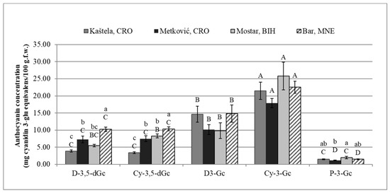 Anthocyanin concentration (mg cyanidin-3-glucoside equivalents per 100 g fresh weight) in the ‘Barski slatki’ at four locations. Values are presented as mean ± SE (n = 3). Different lowercase letters indicate significant differences among locations for each individual anthocyanidin at p ≤ 0.05 according to the LSD test. Different uppercase letters indicate significant differences within locations in the relative proportions of individual anthocyanidins. Abbreviations: D-3,5-dGc, delphinidin-3,5-diglucoside; Cy-3-dGc, cyanidin-3-diglucoside; D-3-Gc, delphinidin-3-glucoside; Cy-3-Gc, cyanidin-3-glucoside; P-3-Gc, pelargonidin-3-glucoside.