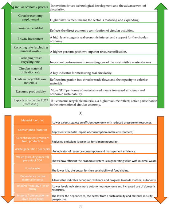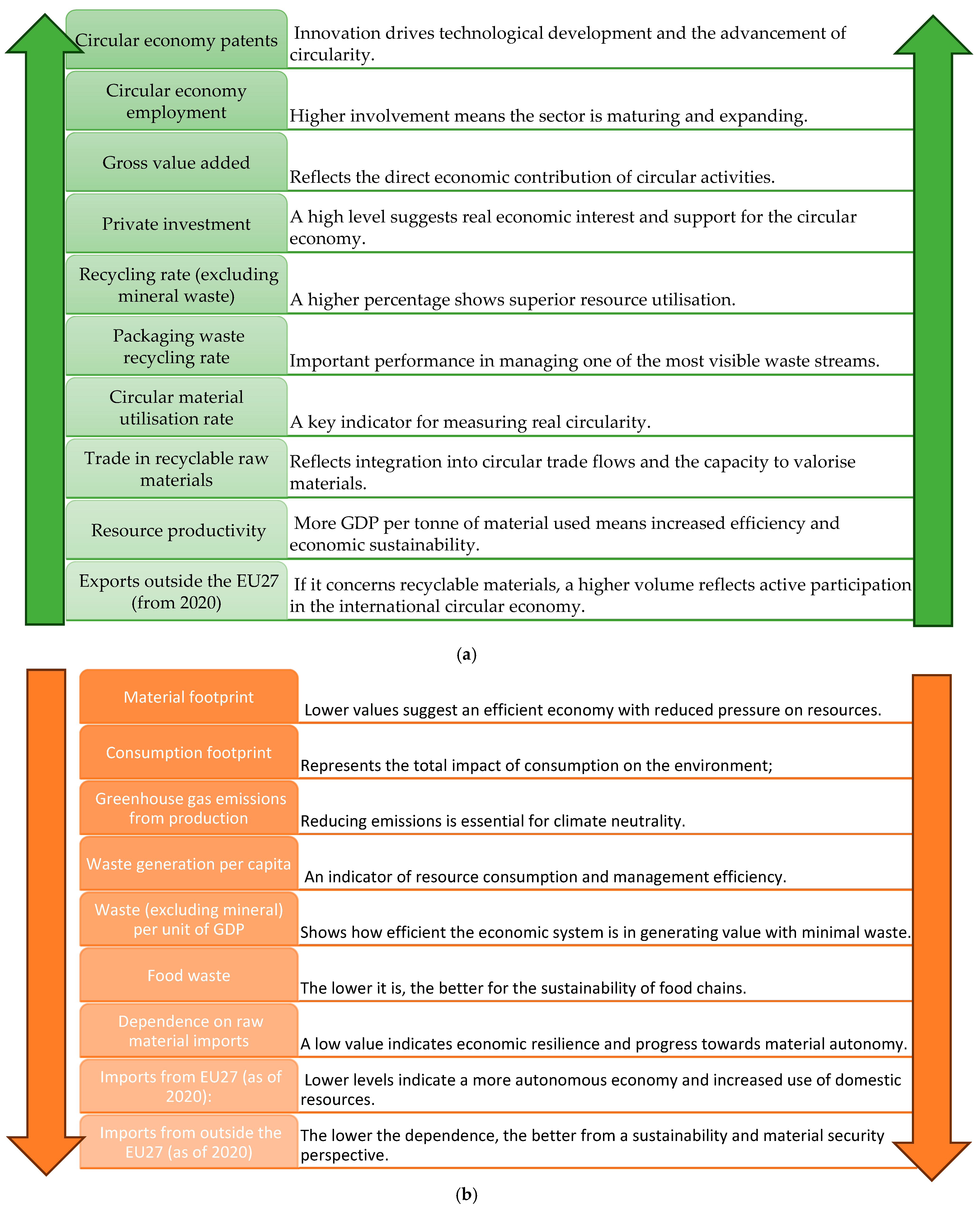 The selection of indicators followed an eligibility process to support sectoral applicability. There were three main criteria that guided the process for indicator selection. First, they needed to illustrate direct or indirect connections with agri-food supply chains such as production, processing, distribution, consumption, disposal, and resource recovery. Indicators measuring waste generated in other sectors, with no relation to agri-food, for example, construction, extractive industry, etc., such as mineral waste production, and the recycling of construction materials, were excluded. Second, only indicators with availability and comparable measurement units for both Romania and the EU average were retained. Lastly, preference was determined to be interpretability in the agri-food context, thus the exclusion of indicators with poor sector specificities, like urban waste per capita or bioenergy from forestry residues, which have no contribution specifically associated with food systems. This approach is in line with recent work that combined contextual selection and methodological compatibility in circular economy analyses [