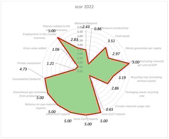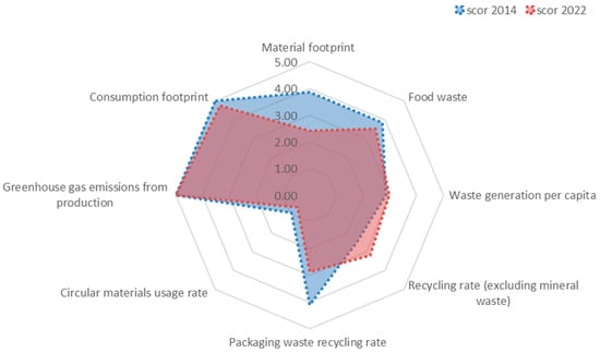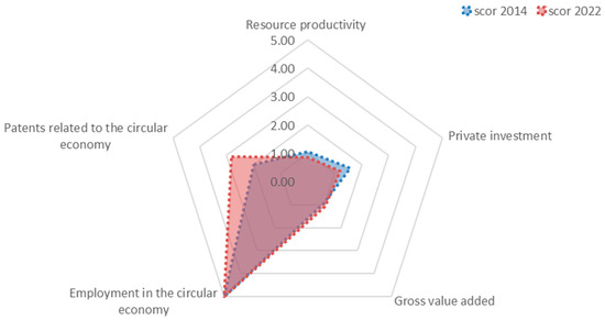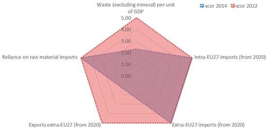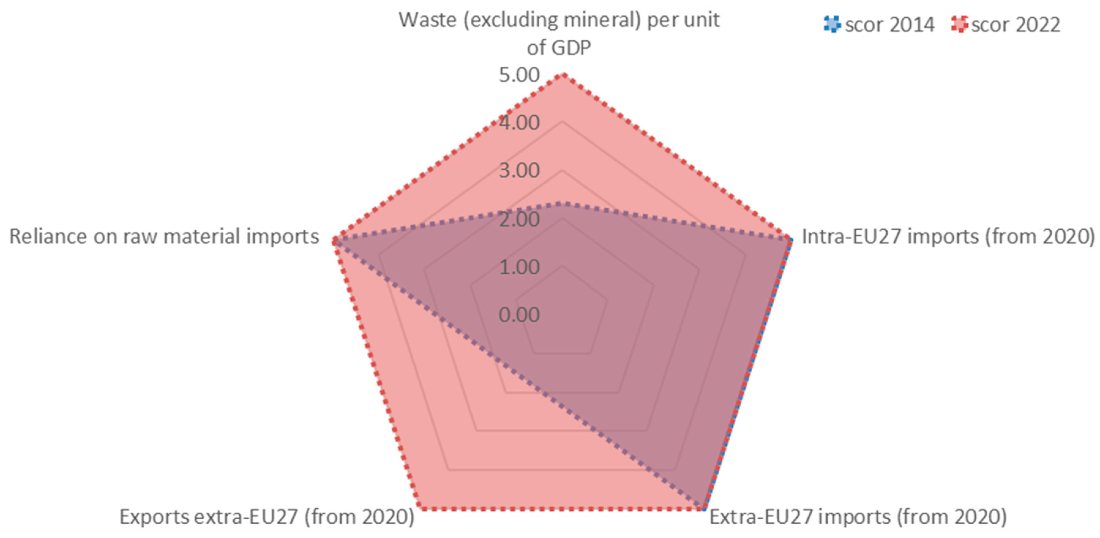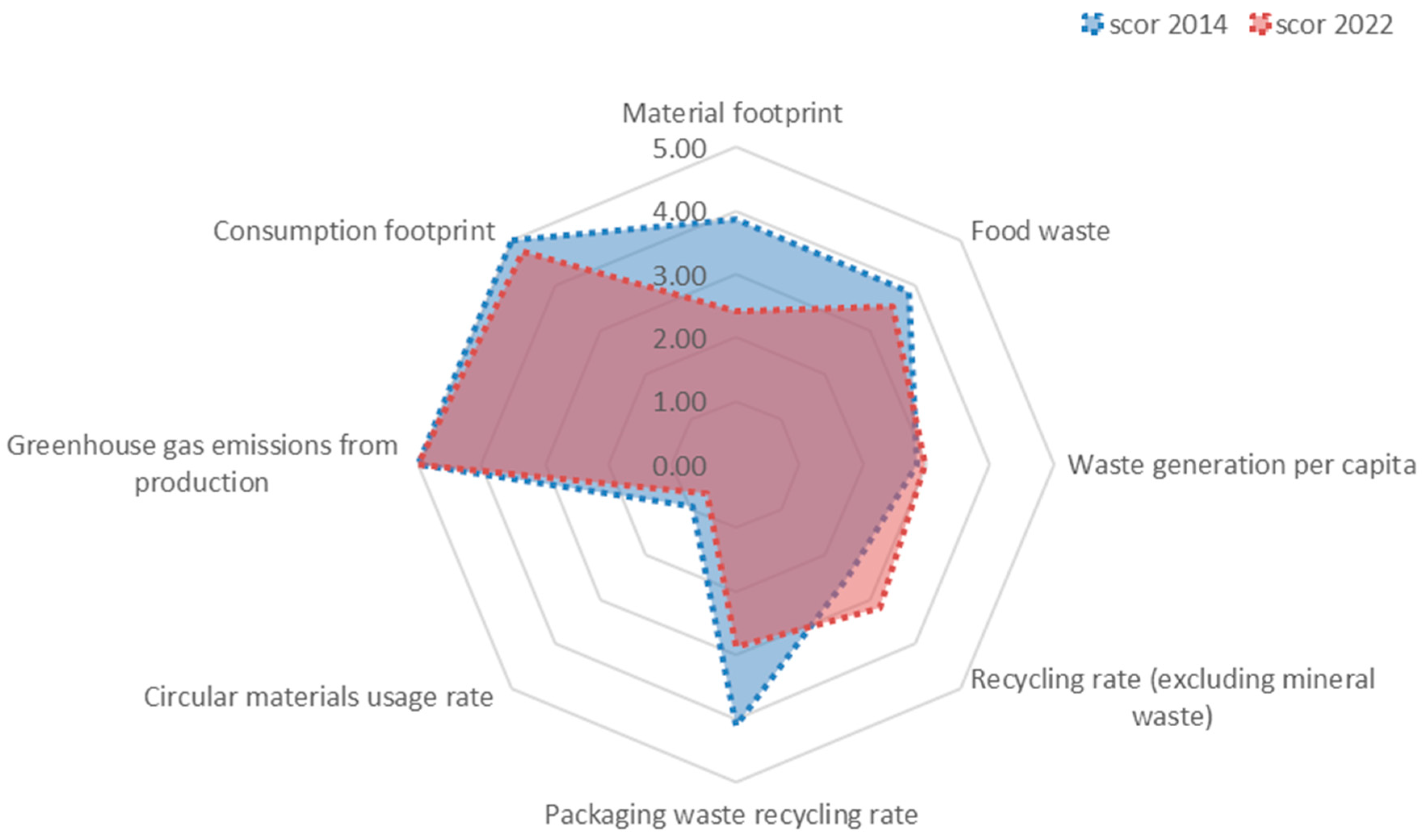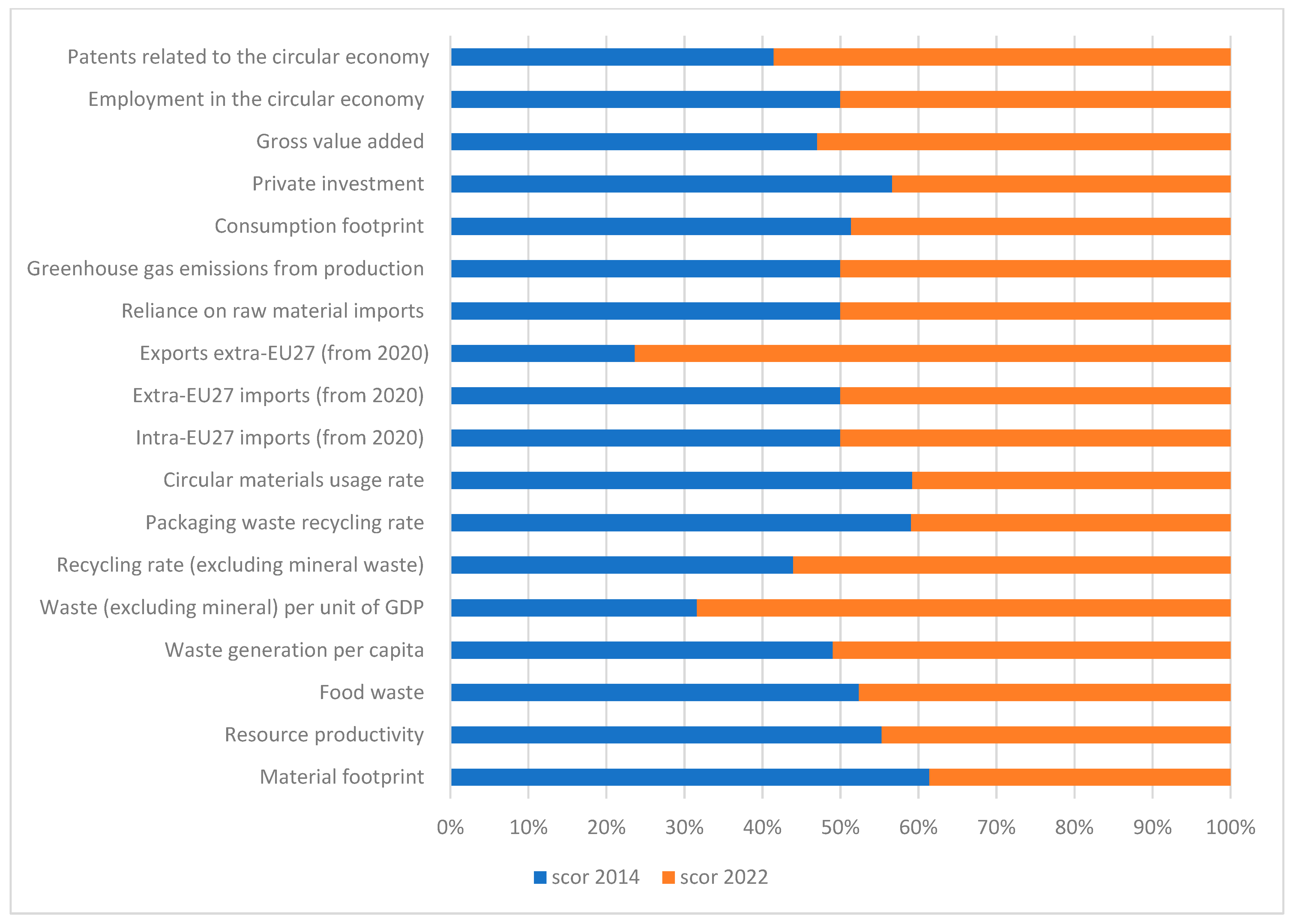 In order to capture the evolution of Romania’s performance over time in the field of circular economy, the score was calculated for two reference years: 2014 and 2022. The choice of these years allows for the observation of the progress, or regress, recorded over a period of almost a decade, in the context of continuously transforming European policies, the funds available for the green transition, and the evolution of the national economic and social context. The choice of 2014 as a baseline and 2022 as the most recent available year was also motivated by policy cycles: the period broadly overlaps with the first EU Circular Economy Action Plan (2015–2020), followed by its reinforcement in the 2020 Circular Economy Action Plan, allowing us to capture the structural changes associated with these two major strategic frameworks [