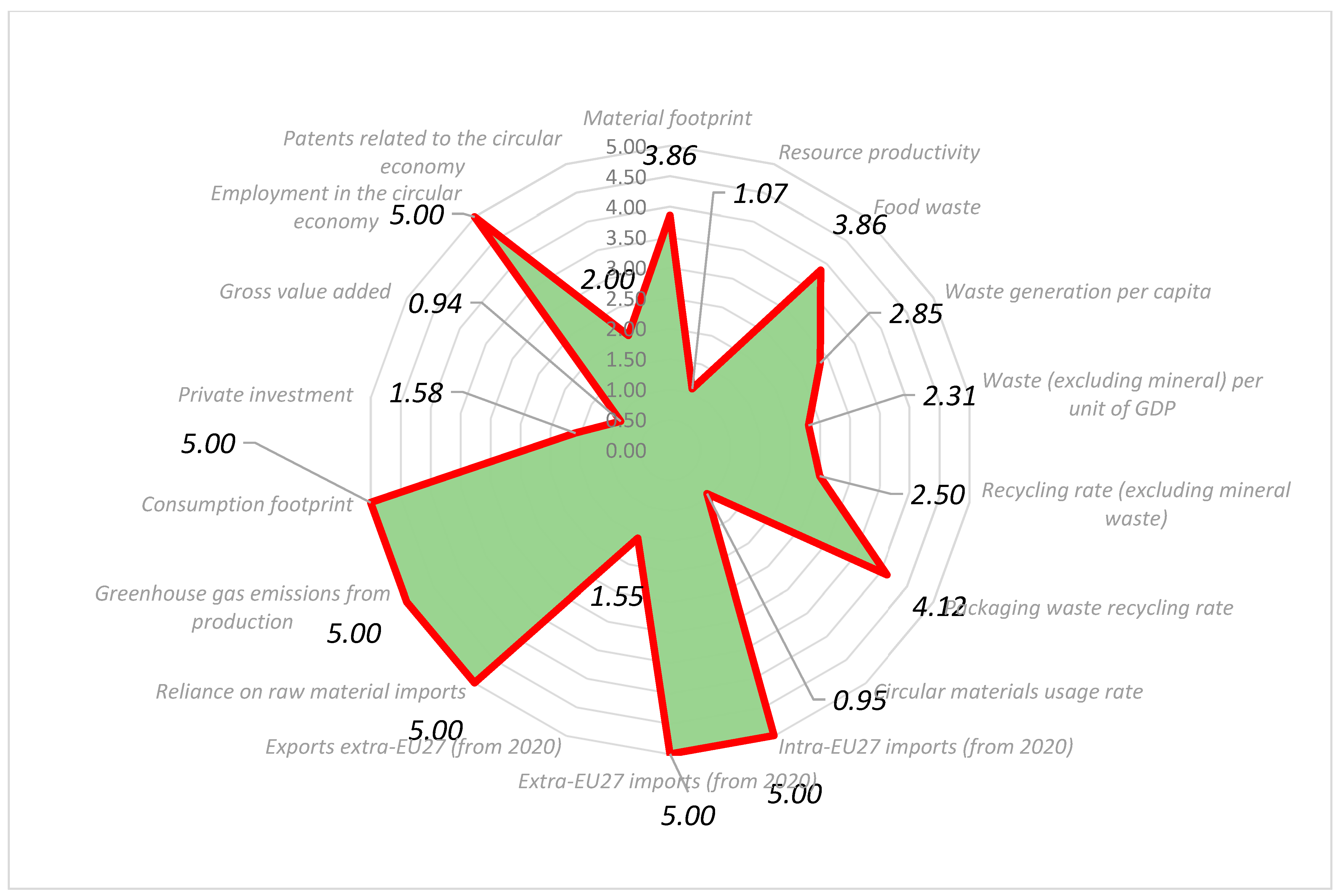 Therefore, in order to assess Romania’s positioning in relation to the European Union average in the field of circular economy, a composite, weighted, and normalized score was developed, as described below.