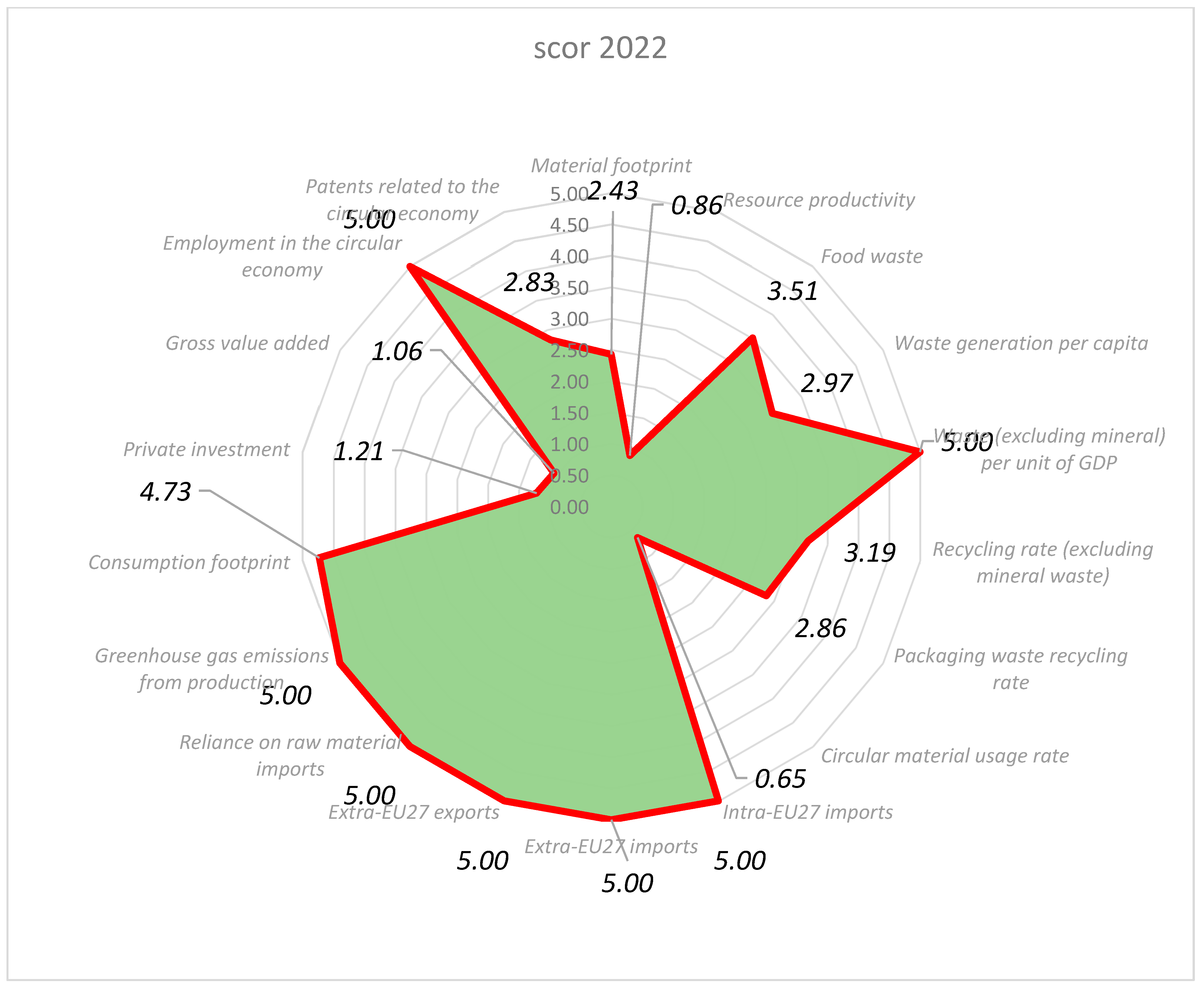 The economic dimension remains the vulnerable point of the circular transition. The average score increased only marginally, from 2.12 to 2.19, signaling a reduced capacity for the economic valorization of circular principles. Despite an advance in innovation (patents) and a slight increase in gross value added, private investment and resource productivity remain significantly below the EU average. This stagnation suggests that political and financial support for circular entrepreneurship and technology transfer is still insufficient.