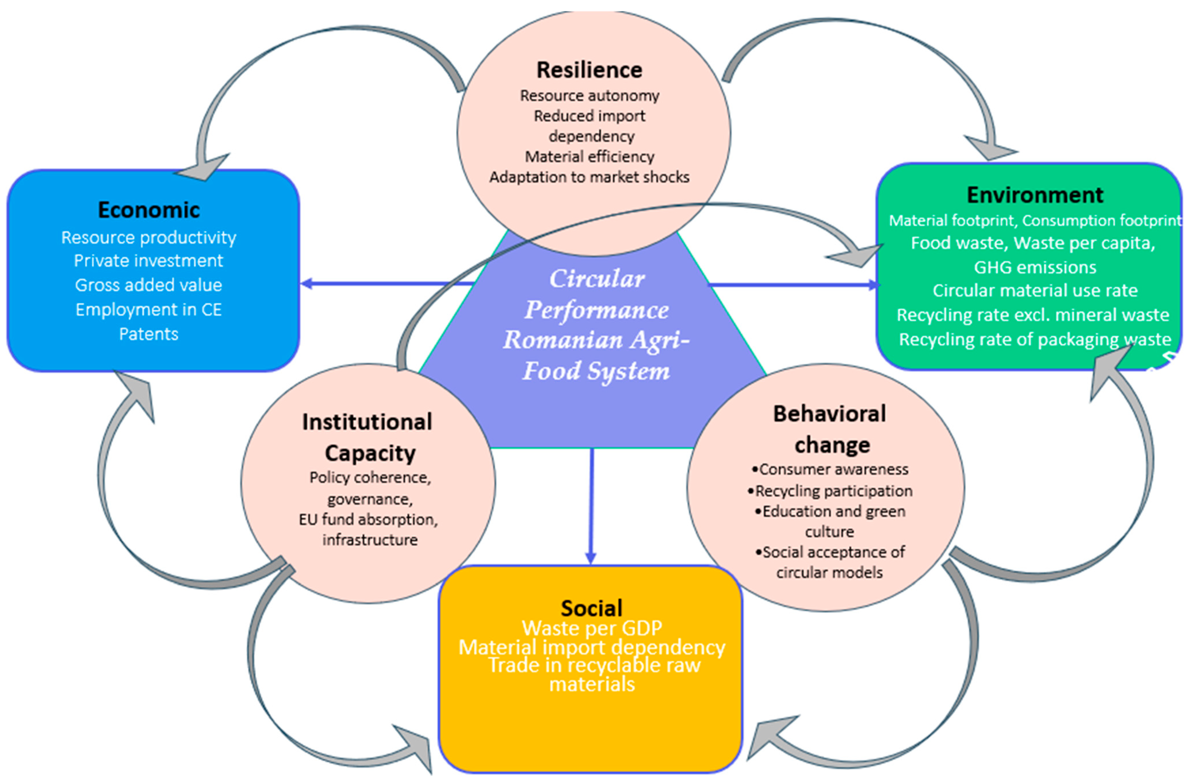 Therefore, the processes of circular transition in the agri-food system of Romania need to provide a balance of resource availability and systemic capability of the feeding systems of the economy with economic efficiencies while providing for social inclusion and institutional capacity.