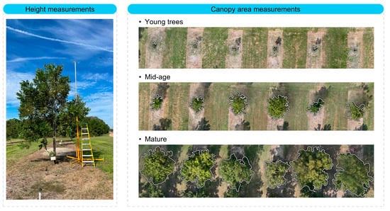 Ground-truth data collection for the pecan field. Ladder and pole for measuring tree height (left). Computer-aided measurement of canopy area (right).