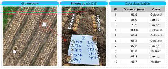 Field 2: For bulb counting, we delineated five plots of 10 m2 and counted all onions within them, totaling 697 onions. For diameter measurements, 20 georeferenced sample points were established across the field. At each point, ten onions were measured and labeled (Figure 3). Bulb diameter was measured using digital calipers at the equatorial point of each analyzed bulb. No soil removal was performed; onions remained under standard field conditions throughout data collection. Bulb diameter was also used for market classification: medium (<76.2 mm), jumbo (76.2–95.3 mm), and colossal (>95.3 mm) [21]. According to GDA [21] standards, there is a 5% tolerance for onions smaller than the minimum specified diameter and a 10% tolerance for larger onions. The diameter measurements and market classifications were calculated and later compared to the AI-driven web platform (Solvi).