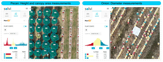 As digital tools become more integrated into agricultural management, ensuring their accessibility and usability, particularly for smallholder farmers and non-expert users, has become essential [10,11]. One example is Solvi [12], a drone-based analytics platform designed for field trial assessments. Founded in 2015 with the goal of making advanced drone technology accessible and easy to use, Solvi originated as a pilot project with the Swedish University of Agricultural Sciences. Today, it is widely used by farmers, agronomists, and researchers to support more efficient and sustainable crop management. Due to its capabilities, Solvi has been applied in a few studies for image-based analysis, including the determination of in-season nitrogen rates [13] and prediction of grain protein concentration in winter wheat [14], as well as the estimation of leaf nitrogen content, leaf area, berry yield [15], and monitoring and prediction of wild blueberry [16]. However, despite these advantages in data analysis and time-saving potential, its application remains limited in the literature, particularly with respect to biometric and phenotypic data in specialty crops. This gap is especially evident in perennial and vegetable crops such as pecan and onion, which, despite their high economic value and spatially stable planting structures, have received considerably less attention than annual field crops [17].