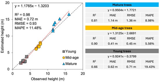 Moreover, when results were split by tree age, the effectiveness of the estimations varied considerably. For young trees, the estimated values showed greater variability and deviated more from the observed values, resulting in R2 = 0.66, MAE = 0.62 m, RMSE = 0.71 m, and MAPE = 19.43%. For mid-age trees, estimated values were closer to the observed values and more consistent (R2 = 0.90, MAE = 0.41 m, RMSE = 0.45 m, MAPE = 5.56%). For mature trees, results were also more consistent compared to young trees (R2 = 0.81, MAE = 1.14 m, RMSE = 1.36 m, and MAPE = 8.98%). Additionally, the regression models exhibited an interesting pattern: young and mid-age trees were underestimated, while mature trees were overestimated compared to the observed data. However, the supplementary statistical comparison using a one-way ANOVA revealed a significant difference only for young trees (p = 0.032), indicating a slight underestimation of height values by the model at early growth stages (Figure S1). In contrast, no statistically significant differences were found for mid-age (p = 0.212) and mature trees (p = 0.178), confirming a strong consistency between estimated and observed measurements for advanced developmental stages.
