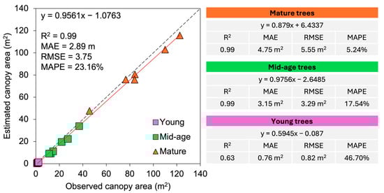 Regarding canopy area estimation, the results achieved a higher efficiency (Figure 6). The estimated and observed data reached an almost perfect fit (R2 = 0.99) while also producing low errors (MAE = 2.89 m2, RMSE = 3.75 m2, and MAPE = 23.16%). When results were analyzed by tree age, the estimated canopy area for young trees was less effective (R2 = 0.63, MAE = 0.76 m2, RMSE = 0.82 m2, and MAPE = 46.70%), whereas mid-age and mature trees exhibited high precision and accuracy metrics (R2 > 0.99, MAE = 3.15–4.75 m2, RMSE = 3.29–5.55 m2, and MAPE = 5.24–17.54%). Results for young trees underestimated the observed values. Conversely, results for mid-age and mature trees were very close to the observed values, with only slight underestimation. The ANOVA indicated a significant difference in canopy area for young trees (p = 0.011), indicating model underestimation at early stages (Figure S2). Conversely, no significant differences were found for mid-age (p = 0.226) or mature trees (p = 0.332), confirming strong agreement between estimated and observed values as canopy structure developed.