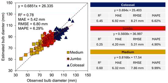 Linear regression between estimated and observed values of bulb diameter across three market classes: medium (brown), jumbo (red), and colossal (dark blue). The dashed black line represents the 1:1 reference, while the solid red line indicates the fitted regression model. A total of 200 onions were measured for medium (n = 33), jumbo (n = 103), and colossal (n = 64).