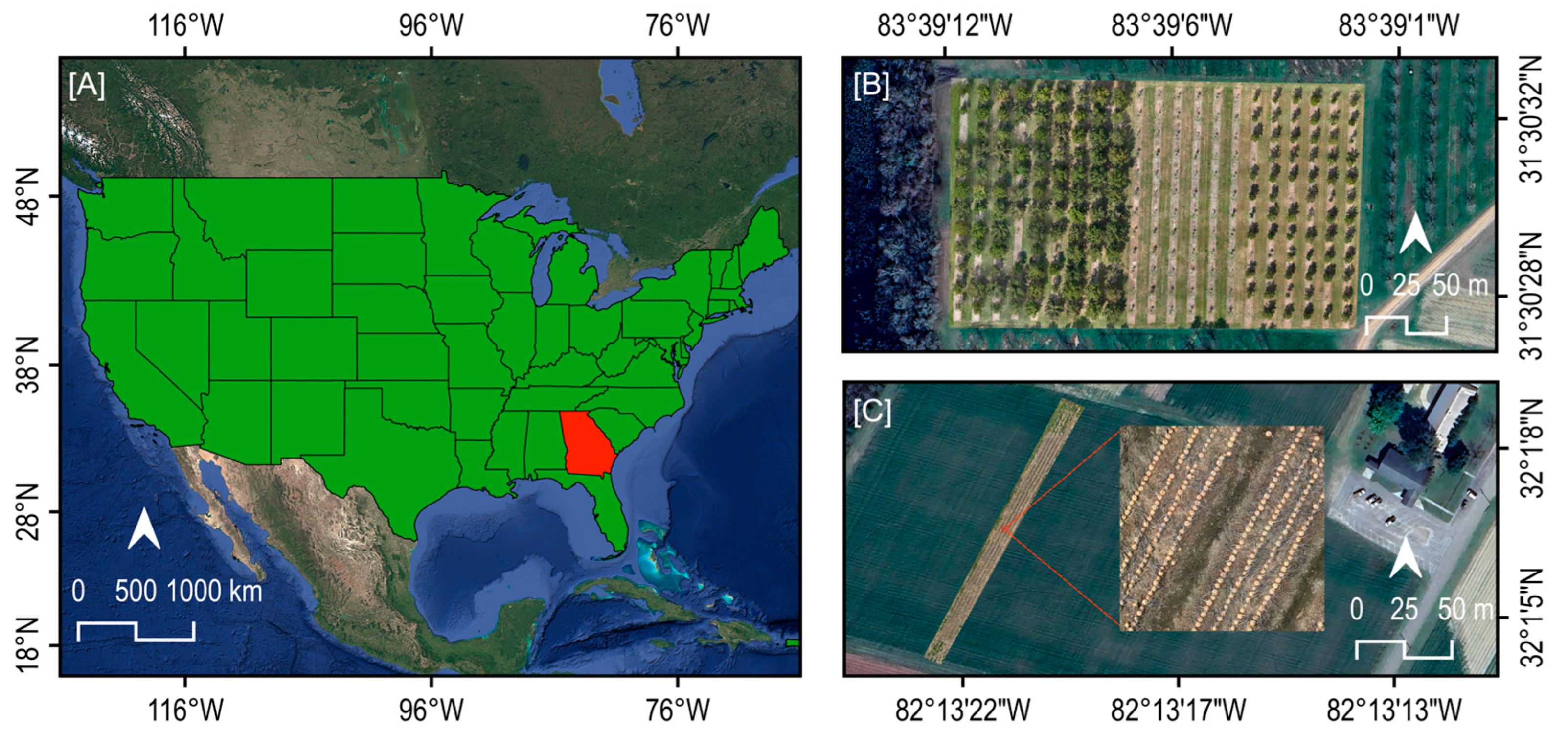 Figure 1B), and the data collection was performed on 28 October 2024. It consisted of a pecan orchard with trees at three distinct developmental stages: young (1–5 years after transplanting), mid-age (5–10 years), and mature (over 10 years). Trees were transplanted in a 14 × 14 m grid. Field 2 was located at the Vidalia Onion and Vegetable Research Center in Reidsville, GA, USA (