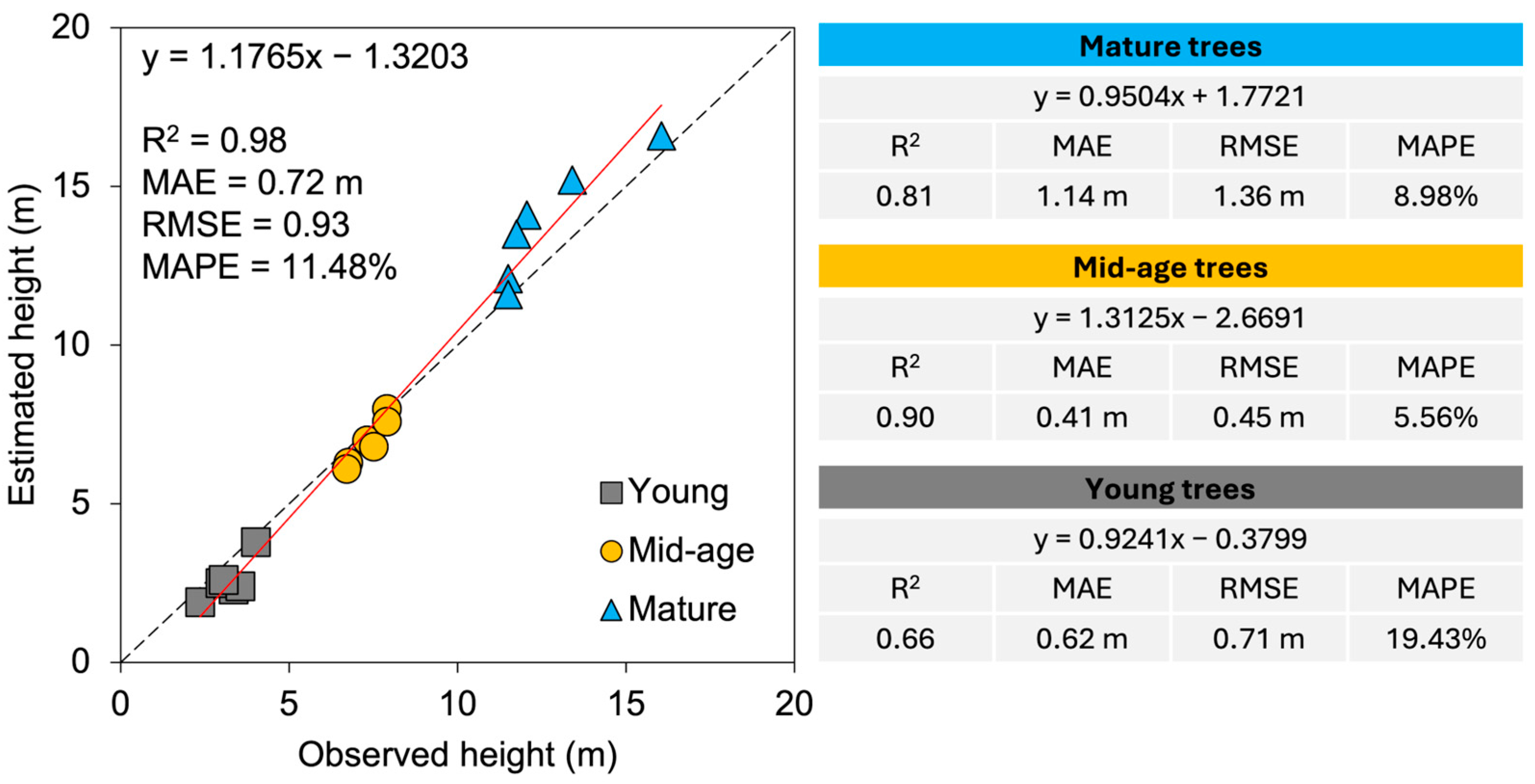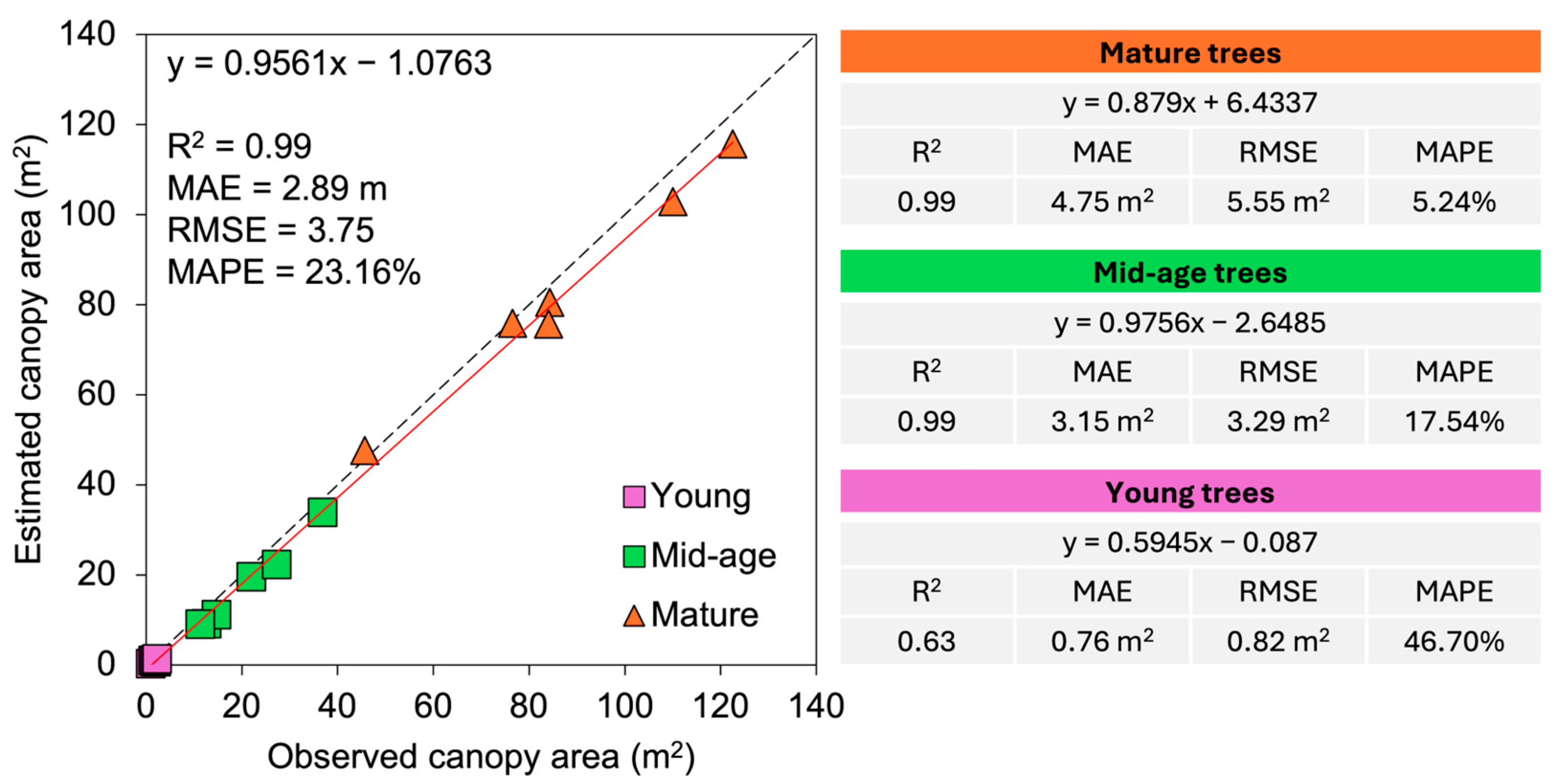 2 > 0.98), and errors were <23.16%. However, the model efficiency varied by developmental stage. For instance, young trees exhibited higher errors for height (19.43%) and canopy area (46.70%) measurement. Although MAE and RMSE were numerically smaller for young trees due to their limited size, relative errors (MAPE) were higher, indicating proportionally lower model efficiency rather than absolute error magnitude. Likely, their smaller stature and reduced pixel representation made the tree detection and further measurement more challenging. These findings are consistent with previous studies, which have shown that limited structural definition in early growth stages impairs UAV-based feature extraction [