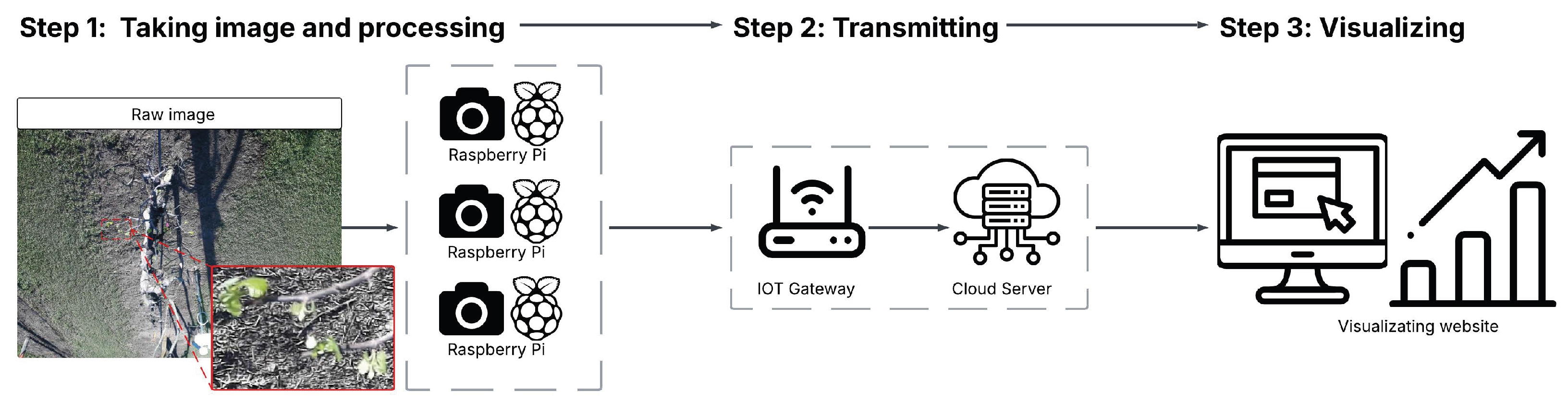 Overview of three-phase processing framework for developing BudCAM. The workflow consists of image acquisition, on-device processing, and transmission of bud counts to a cloud platform. A rectangular callout highlights a sample region of the grapevine canopy, with an inset showing a zoomed-in view of buds within that region for enhanced visual clarity.