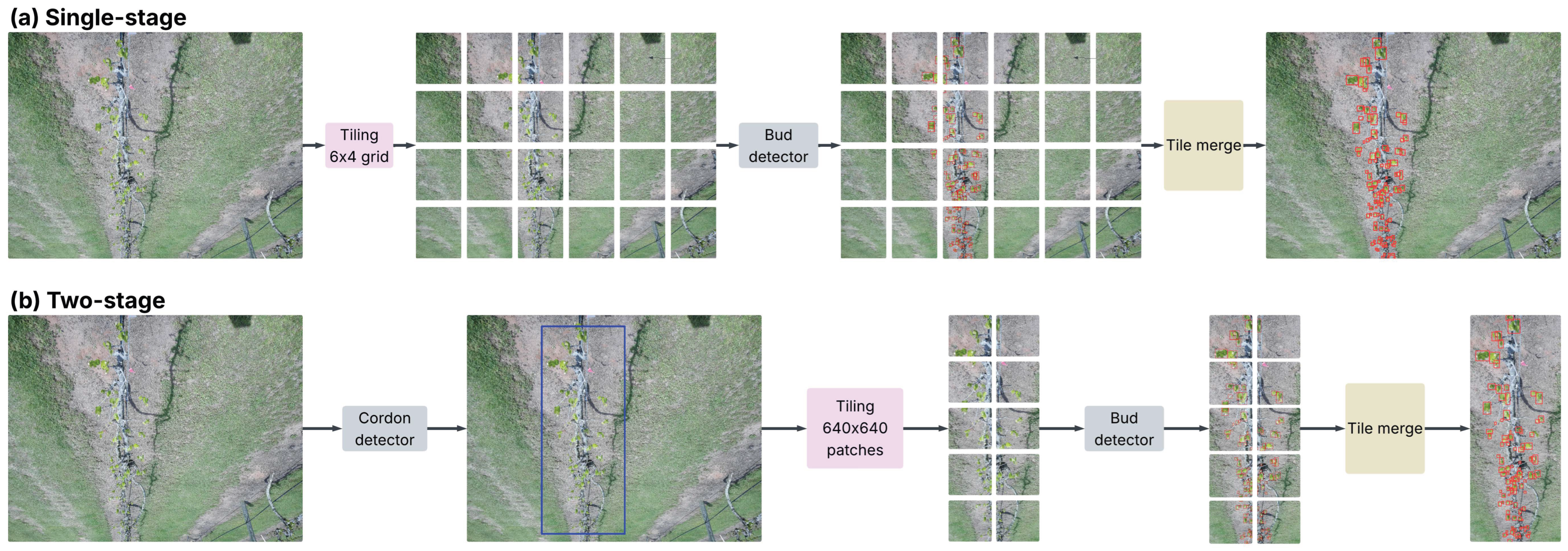Overview of the two detection pipelines. (a) Single-stage bud detector: the raw image is divided into a 6 × 4 grid (tiles of 776 × 864 pixels); each tile is processed by a YOLOv11 bud detector. Tile-level detections are mapped back to the full image and merged to obtain the final bud counts. (b) Two-stage pipeline: a YOLOv11 cordon detector first localizes the grapevine cordon, which is then cropped and partitioned into 640 × 640 pixels patches. These patches are processed by a second YOLOv11 model, and the results are merged. In all panels, detected buds are shown in red and the detected cordon is shown in blue.