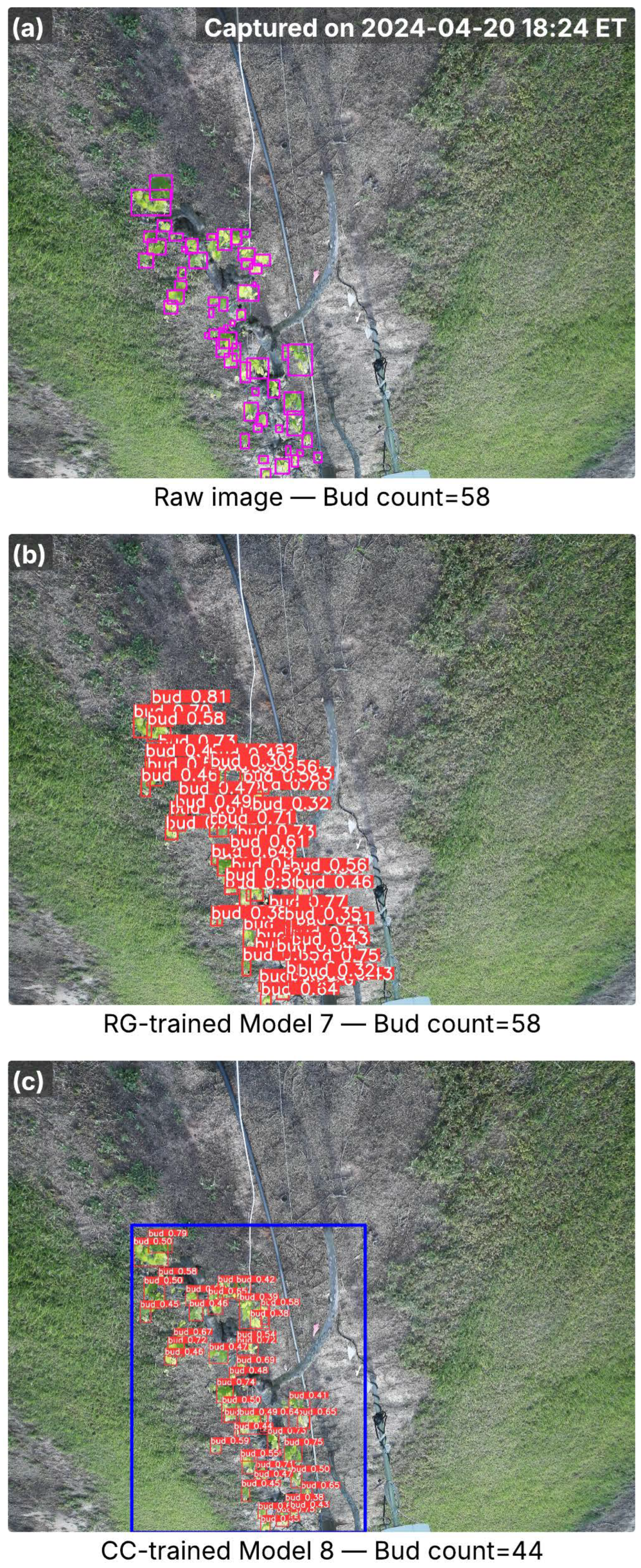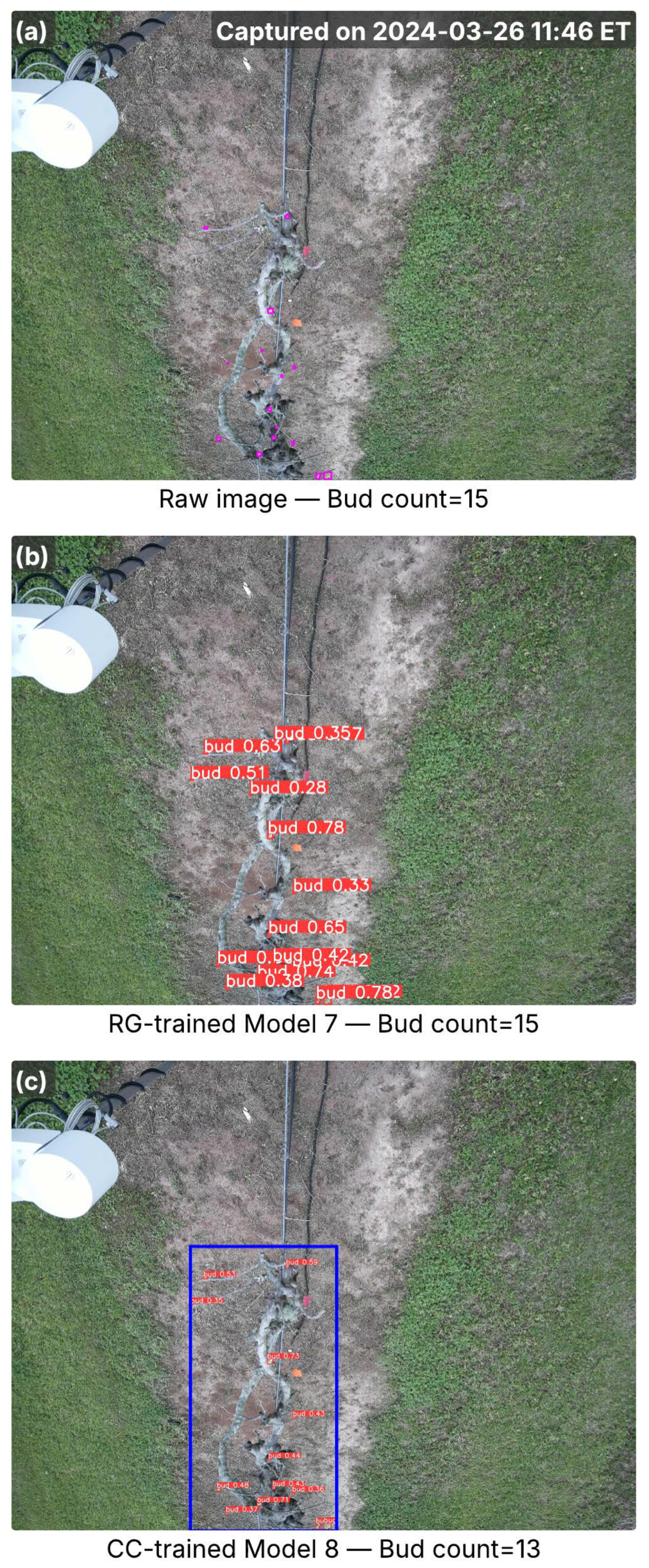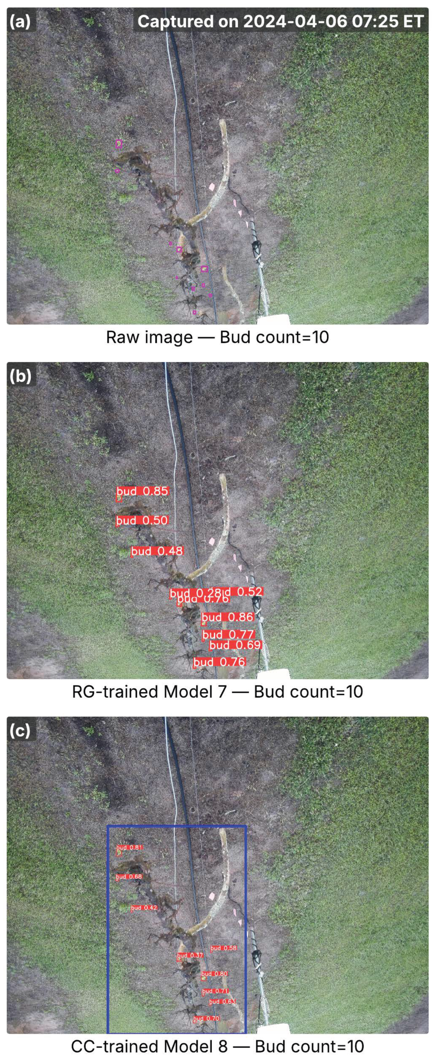 Images from the Floriana cultivar captured in the early bud break season, showing inference results from RG-trained Model 7 and CC-trained Model 8. (a) Raw image with ground-truth buds (pink bounding boxes) and total bud counts; the capture time is marked in the top-right corner. (b) Detection results from Model 7, with red bounding boxes indicating detected buds and associated confidence scores. (c) Detection results from Model 8, where the blue bounding box marks the cordon region identified by the cordon detector, and red bounding boxes denote detected buds with confidence scores. Bud counts in (b,c) represent the total detections per image.