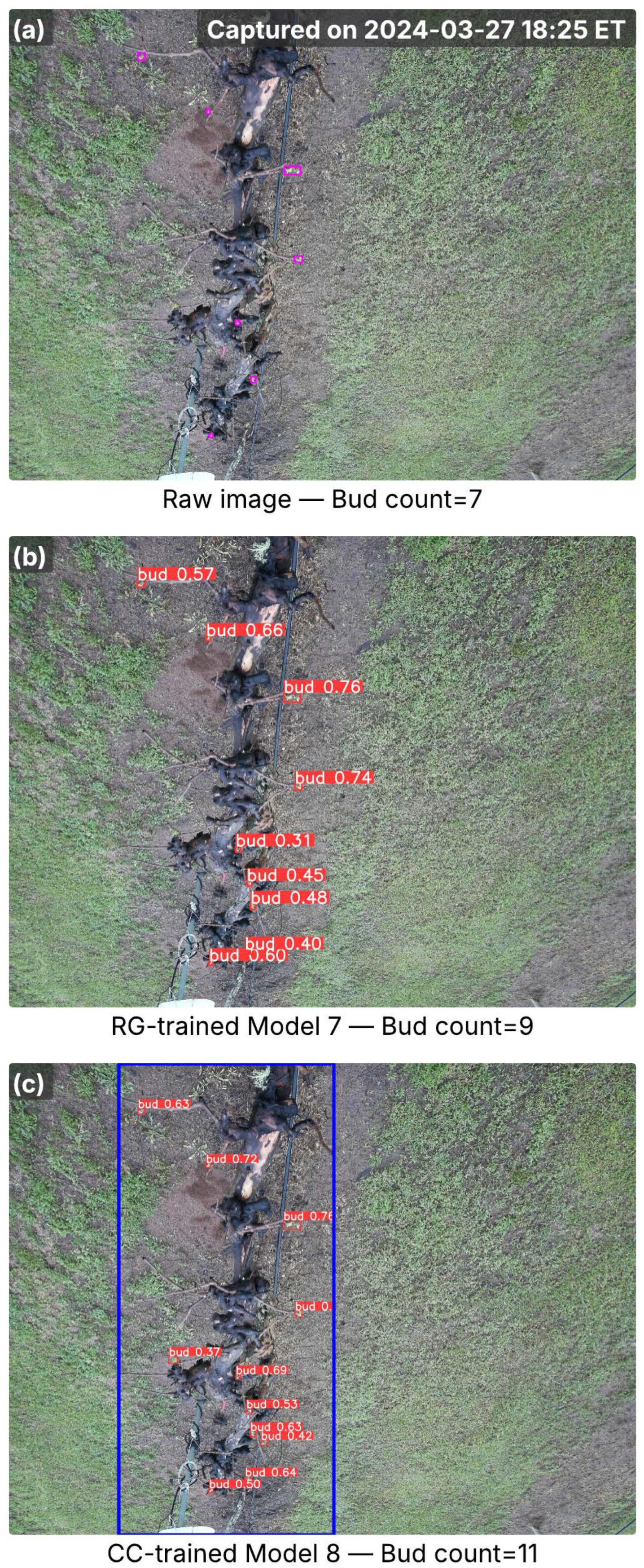 Images from the A27 cultivar captured in the early bud break season, showing inference results from RG-trained Model 7 and CC-trained Model 8. (a) Raw image with ground-truth buds (pink bounding boxes) and total bud counts; the capture time is marked in the top-right corner. (b) Detection results from Model 7, with red bounding boxes indicating detected buds and associated confidence scores. (c) Detection results from Model 8, where the blue bounding box marks the cordon region identified by the cordon detector, and red bounding boxes denote detected buds with confidence scores. Bud counts in (b,c) represent the total detections per image.