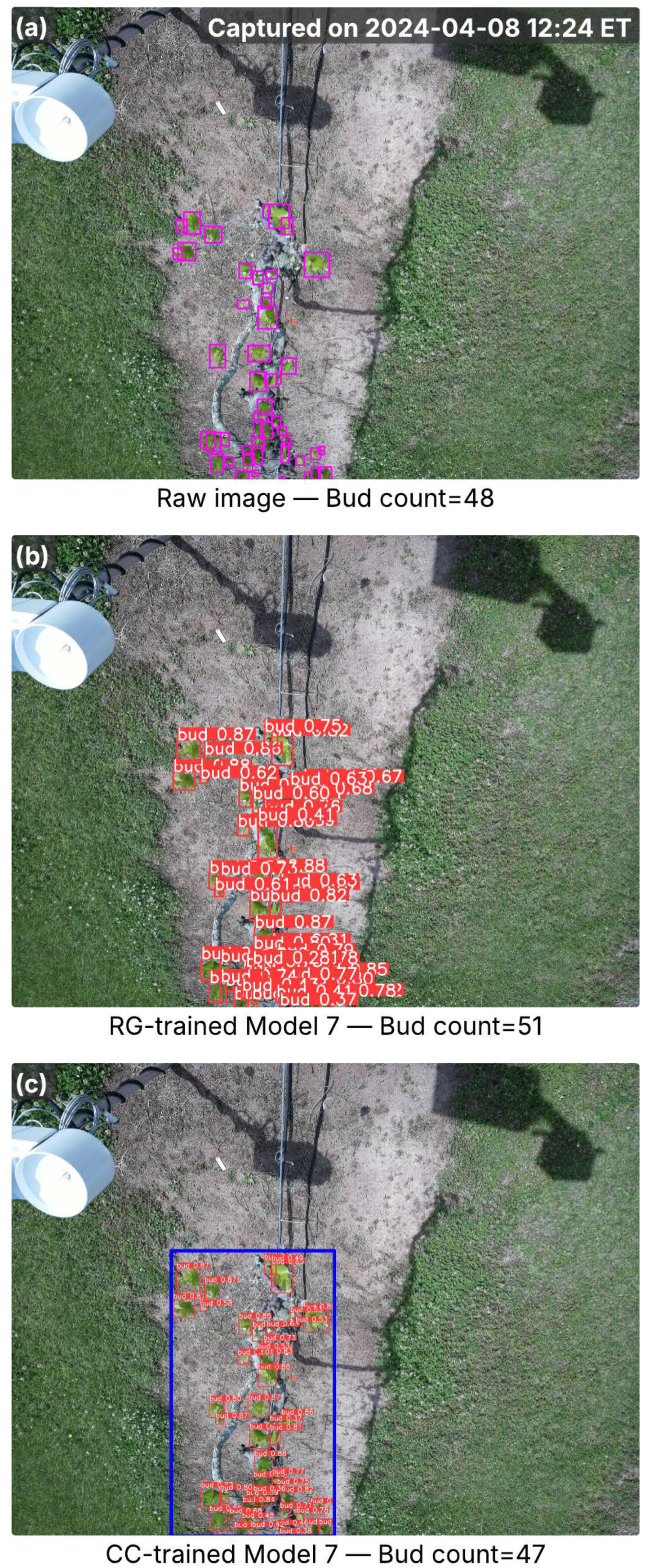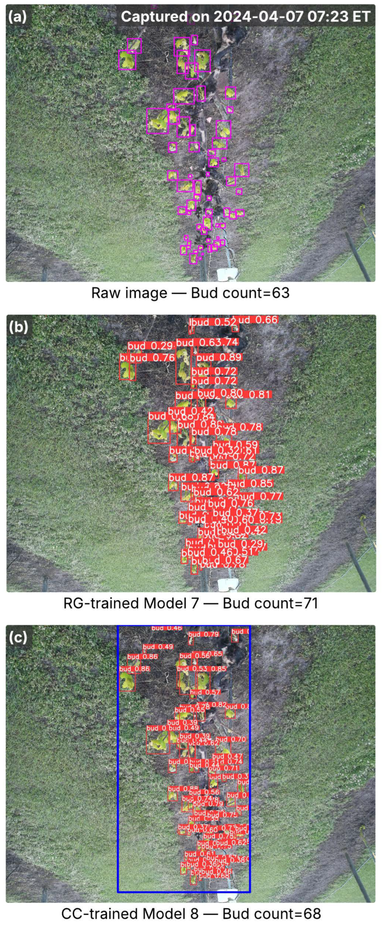 Images from the Noble cultivar captured in the full bud break season, showing inference results from RG-trained Model 7 and CC-trained Model 8. (a) Raw image with ground-truth buds (pink bounding boxes) and total bud counts; the capture time is marked in the top-right corner. (b) Detection results from Model 7, with red bounding boxes indicating detected buds and associated confidence scores. (c) Detection results from Model 8, where the blue bounding box marks the cordon region identified by the cordon detector, and red bounding boxes denote detected buds with confidence scores. Bud counts in (b,c) represent the total detections per image.