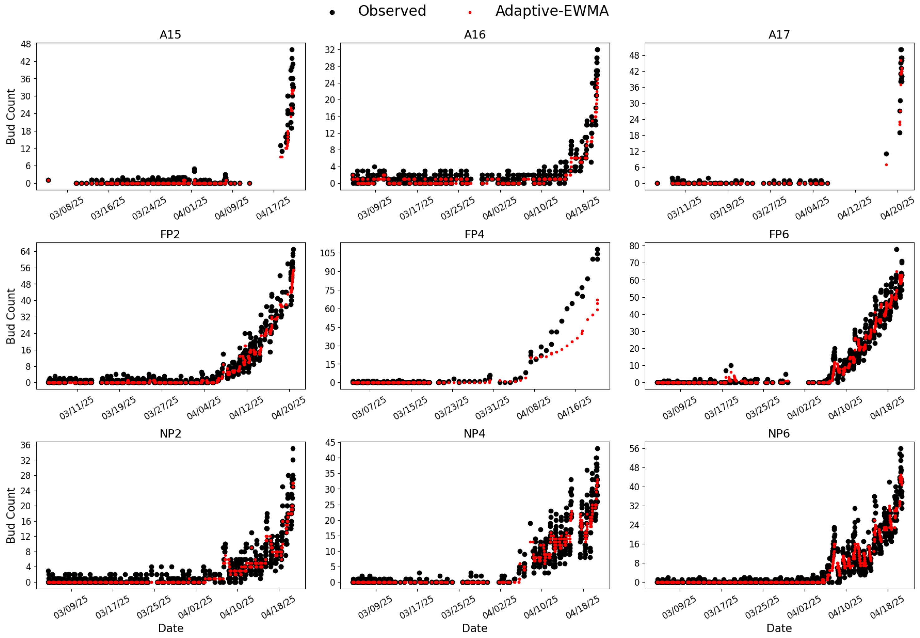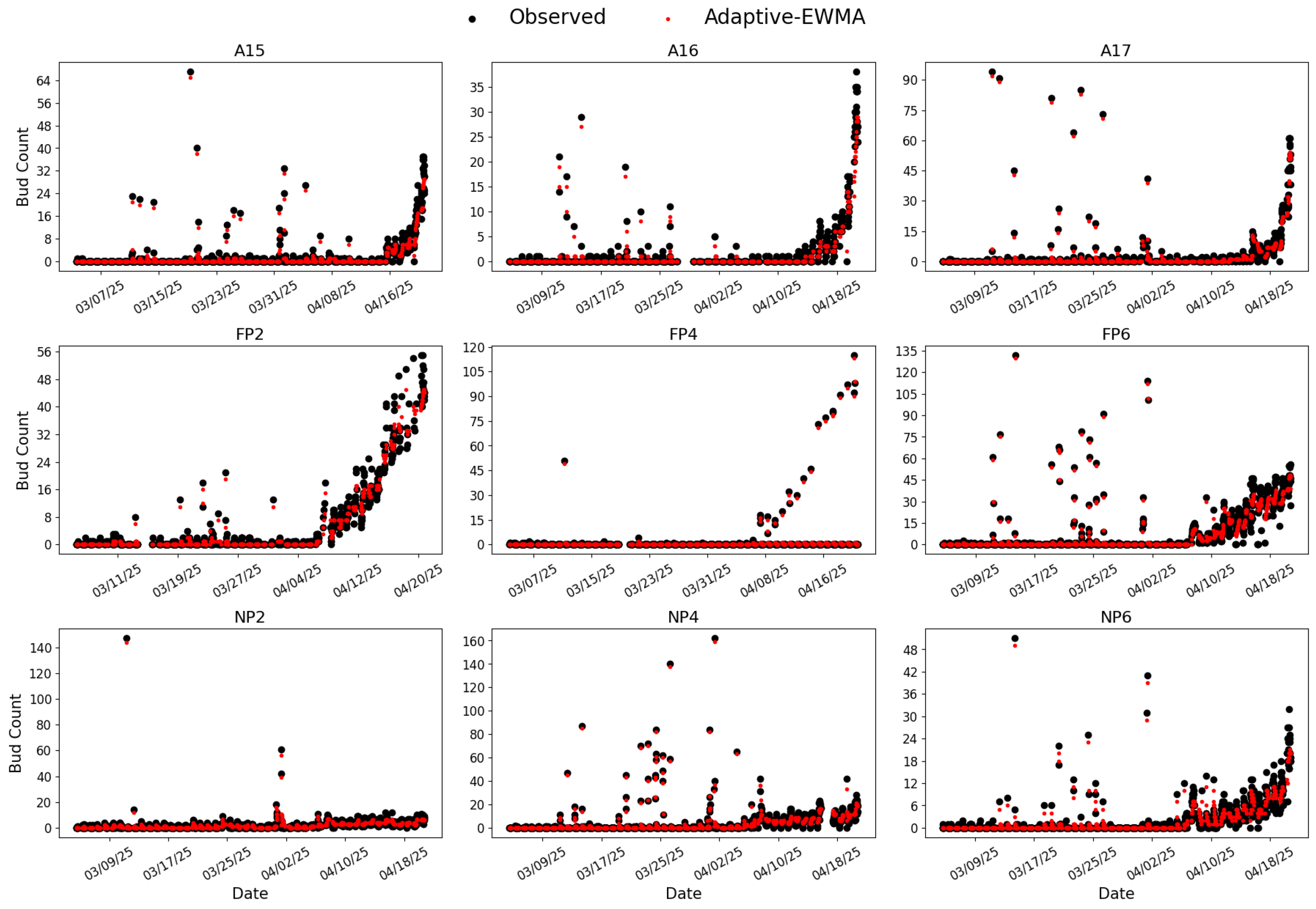 Inference results from RG-trained Model 7 applied to bud season images collected between 3 March and 20 April 2025, across nine BudCAM units deployed in the vineyard. Black dots represent the raw bud counts and red dots represent the smoothed values obtained by the adaptive Exponentially Weighted Moving Average (adaptive-EWMA) filter.