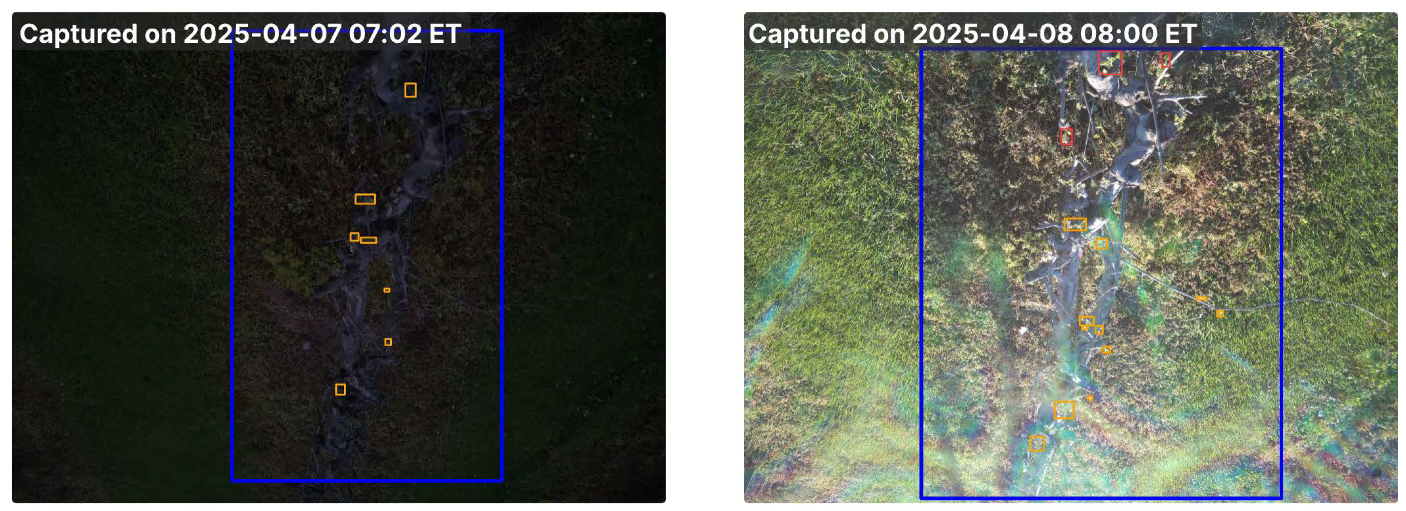 Example of under-detected images processed by CC-trained Model 8. Detected buds are highlighted with red bounding boxes, the non-detected buds are highlighted with orange bounding boxes, and the blue bounding box marks the cordon region identified by the cordon detector.