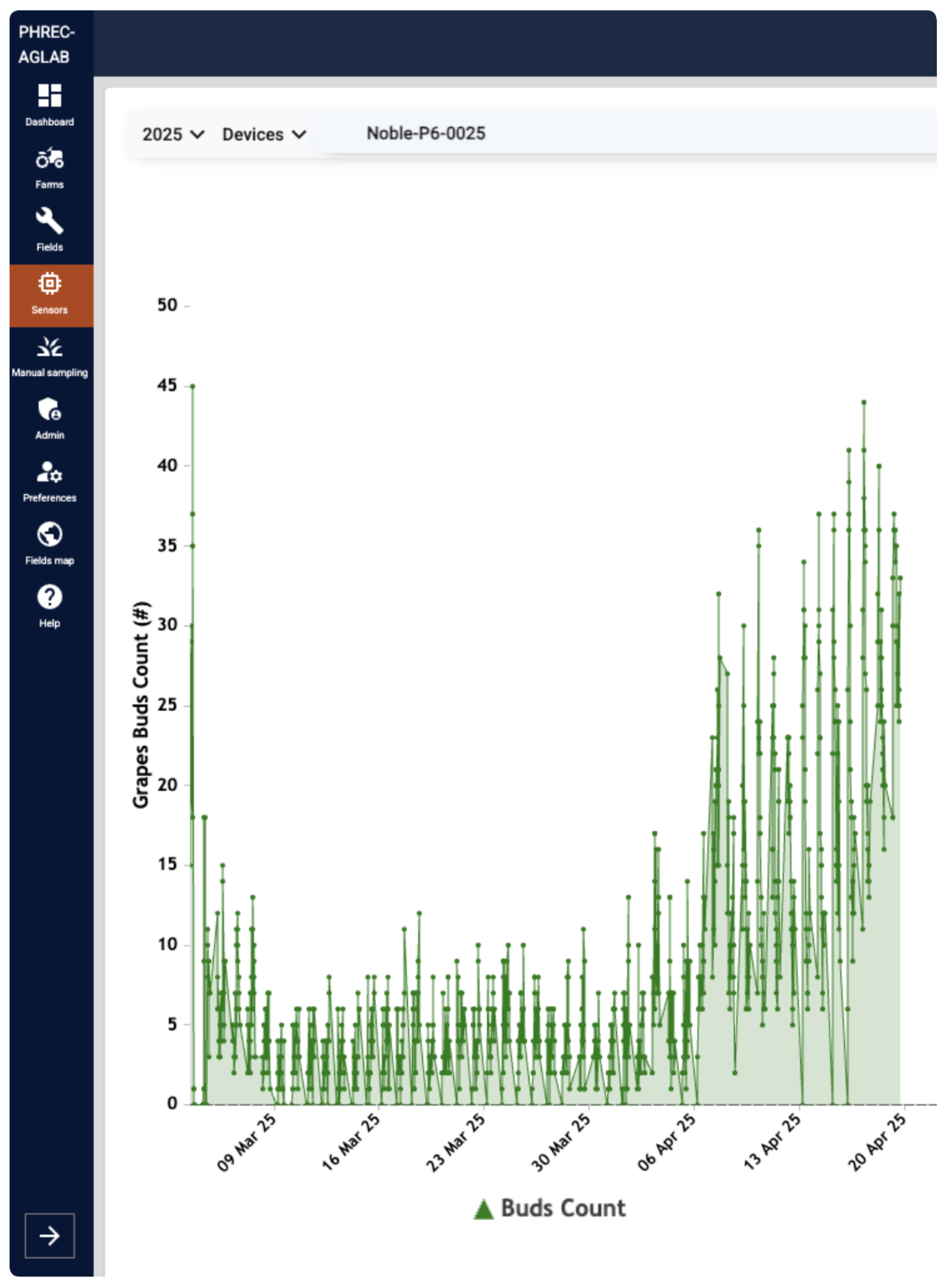 BudCAM node information including cultivar, harvest date, and bud break start and end dates.