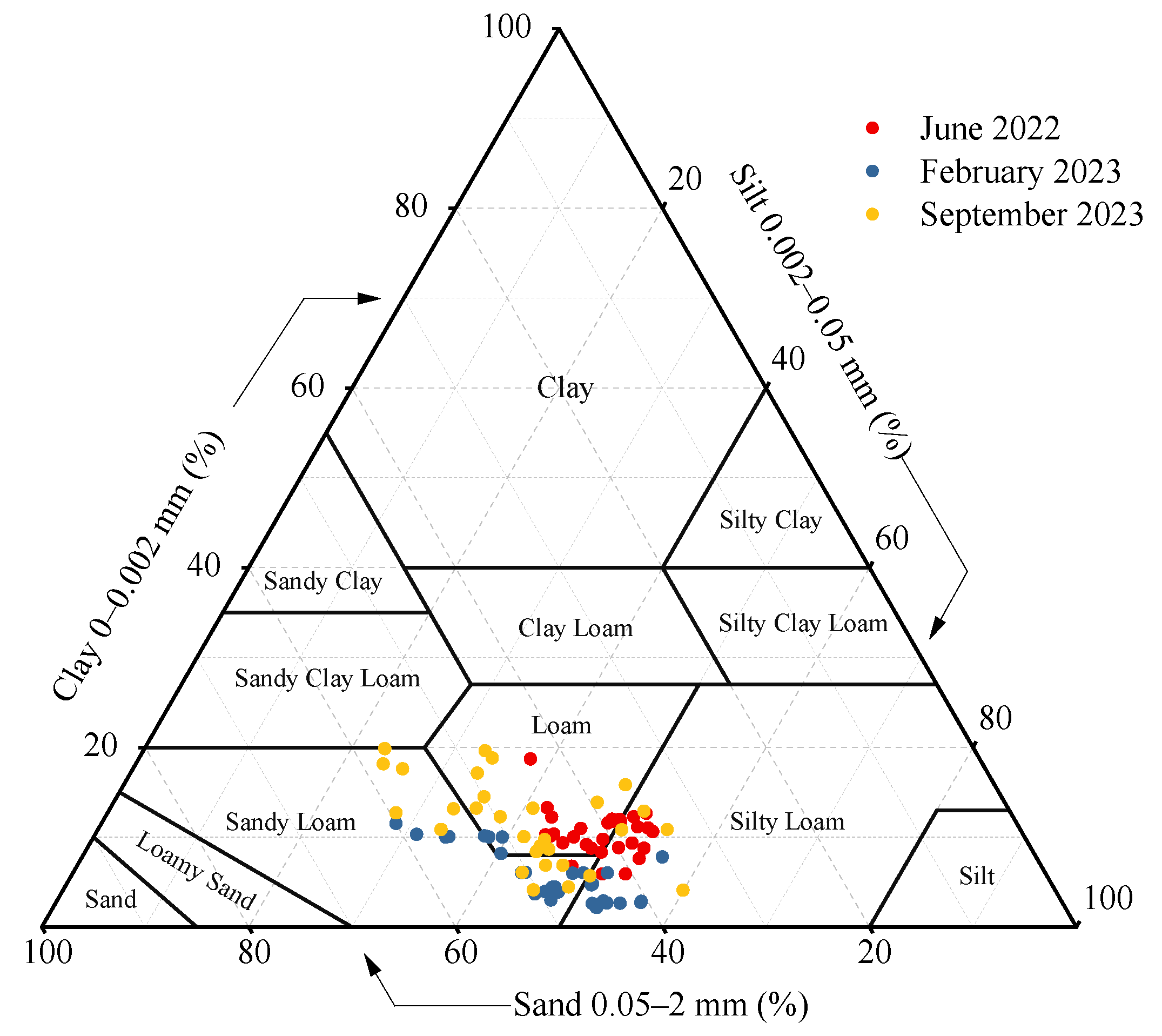 The BD and soil particle density (PD) were determined using the cutting ring method and pycnometer test method, respectively, and the total soil porosity (TP) was calculated according to the BD and PD [25,26] (Table S2). The soil texture was determined using a Mastersizer 2000 (Malvern Panalytical, Ltd., Malvern, UK) and classified as sand (0.05–2 mm), loam (0.002–0.05 mm), and clay (0–0.002 mm) according to United States Department of Agriculture (USDA) standards [27]. The textures of the selected soil samples were loam, sandy loam, and silty loam, as shown in Figure 2.