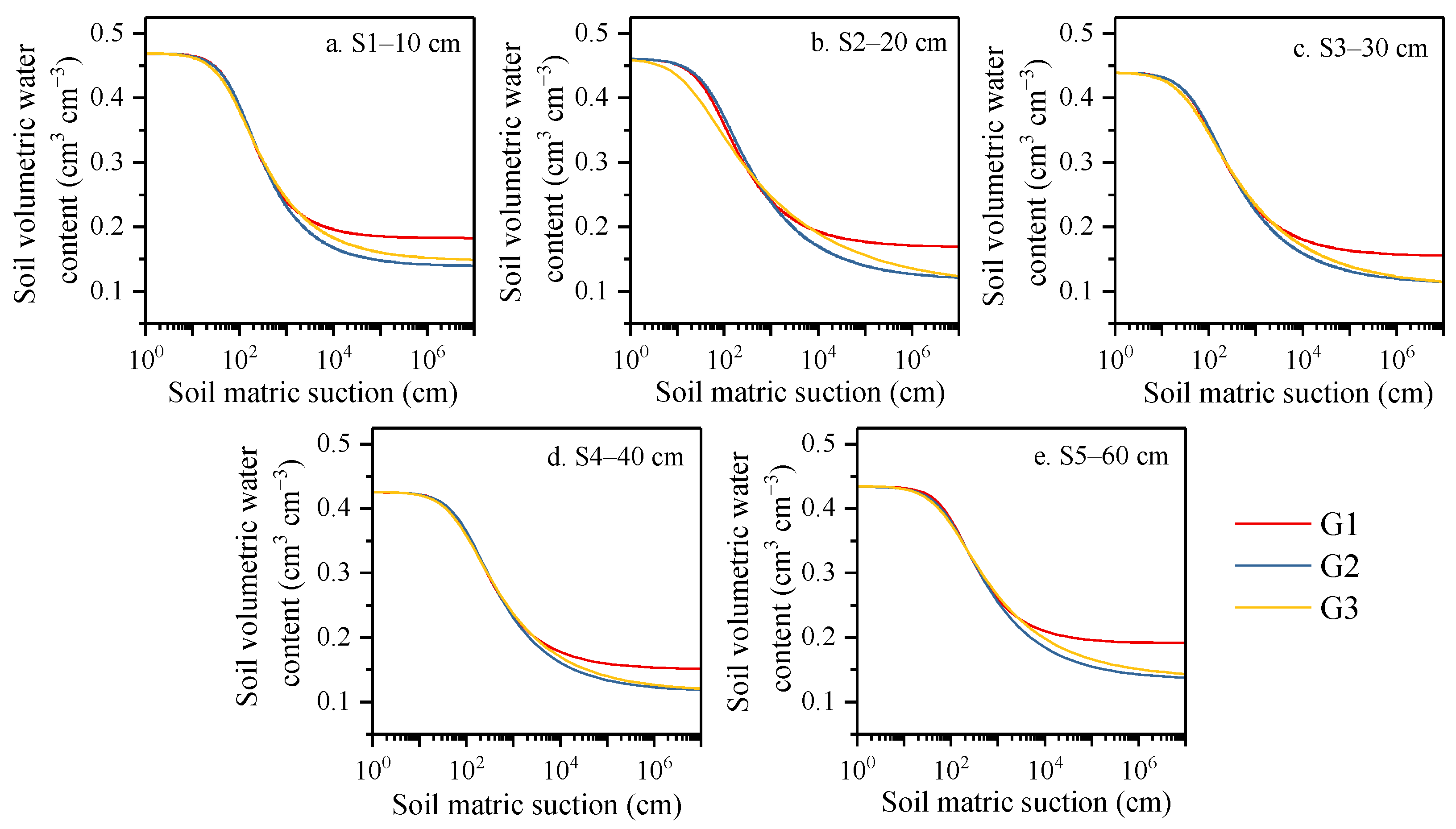 Figure 6 shows SWCCs derived from different methods using soil samples collected in September 2023, with one soil layer depth per plot as a representative case. The results indicated that whether considering soil shrinkage and BD changes (G1) or not (G2), the shapes and positions of SWCCs in the low matric suction segment were nearly identical. However, compared to the G2 method, SWCCs under the G1 method were elevated and exhibited reduced curvature in the medium to high matric suction ranges. For identical matric suctions, the corresponding soil volumetric water content under the G1 method was notably higher, attributable to BD increases caused by soil shrinkage during centrifugation. SWCCs calibrated via raw data in the high matric suction segment (G3) aligned more closely with the curves obtained from the G2 method, though only the calibration points data fully matched. Overall, SWCCs derived from the G3 method were flatter, with lower soil volumetric water content at both extreme low and high matric suction ranges (h > 108 cm). Furthermore, beyond a certain matric suction threshold, differences between SWCCs remained constant.