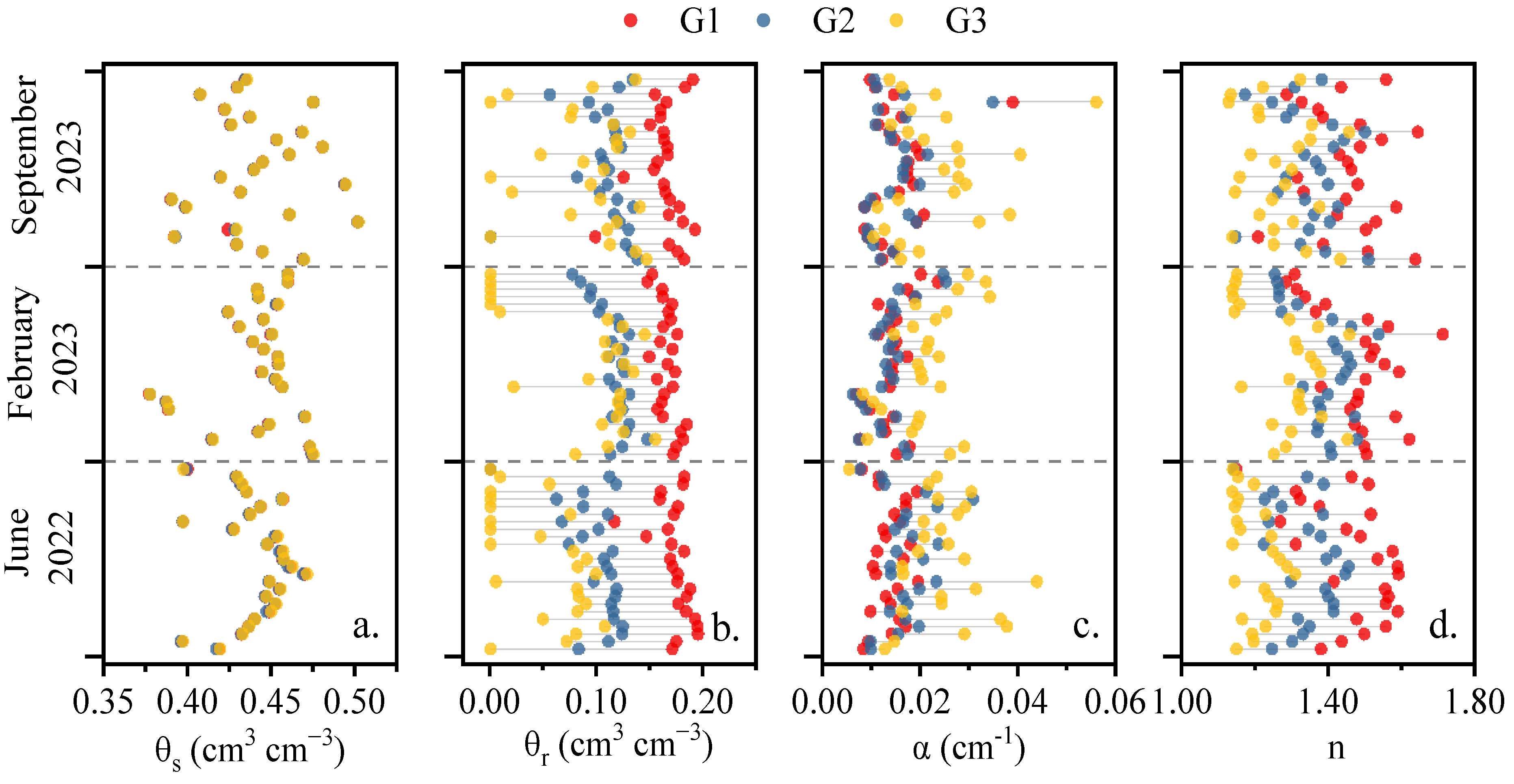 Figure 7. The parameters of the VG model: (a) saturated volumetric water content (θs), (b) residual volumetric water content (θr), (c) inverse of the air-entry value (α), and (d) curve-shape factor (n) across different methods and samplings.
