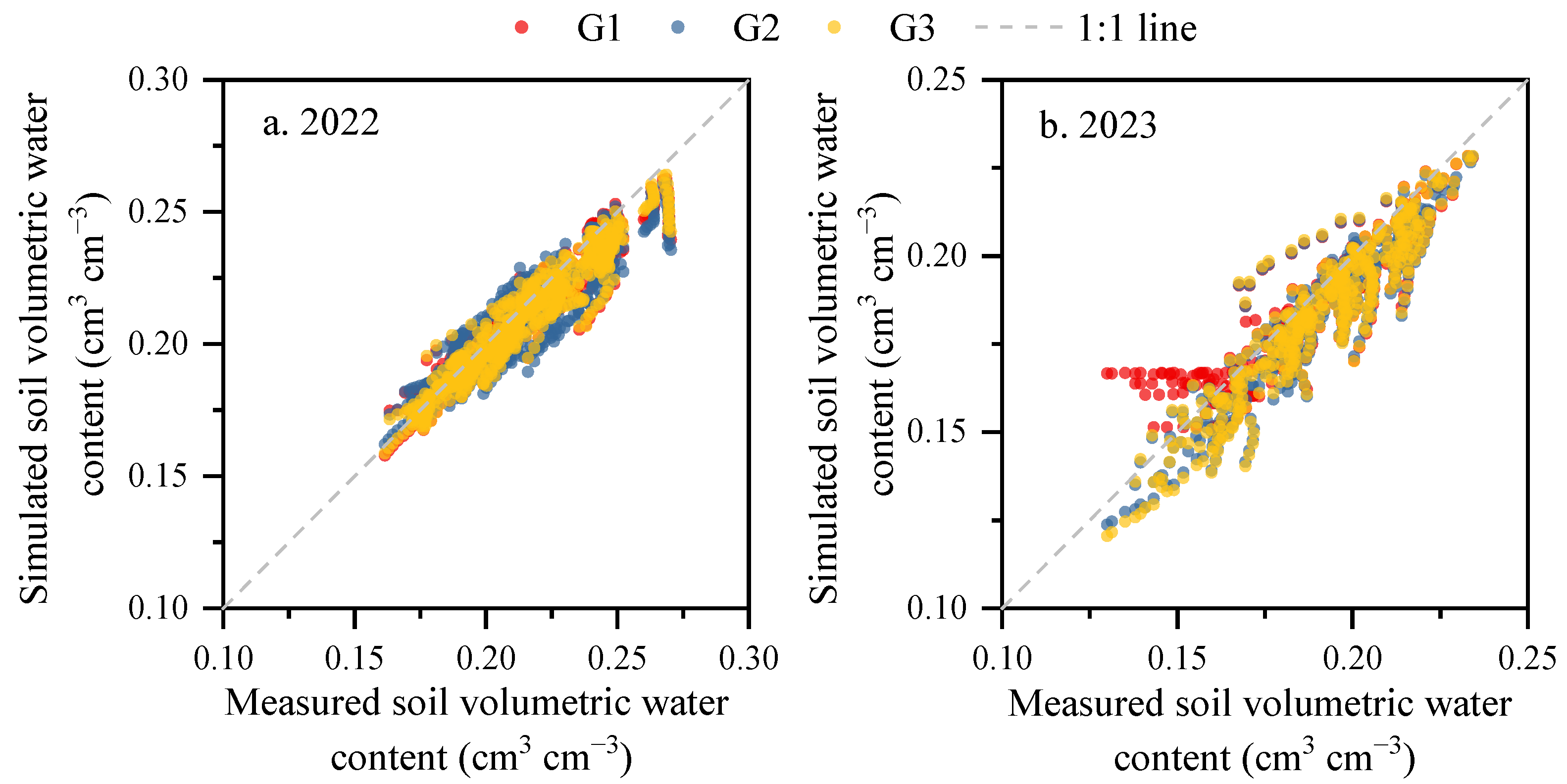 The parameter Ks was measured directly (Table S2), while θs, θr, α, and n were derived from VG models fitted using different methods. Notably, these parameters for the simulations in 2022 (M1–M3) and 2023 (M4–M6) were calculated from soil samples collected in February and September 2023, respectively.
