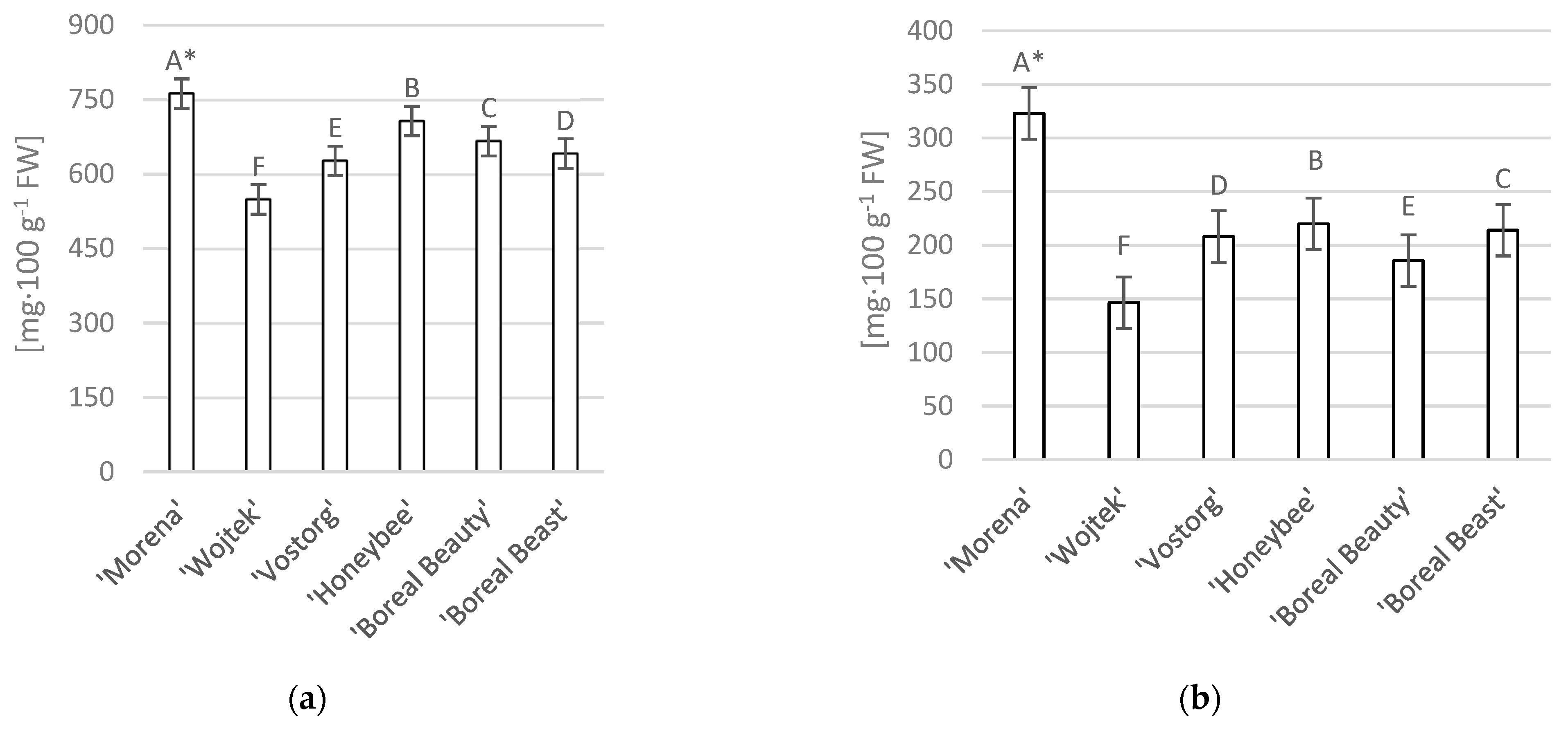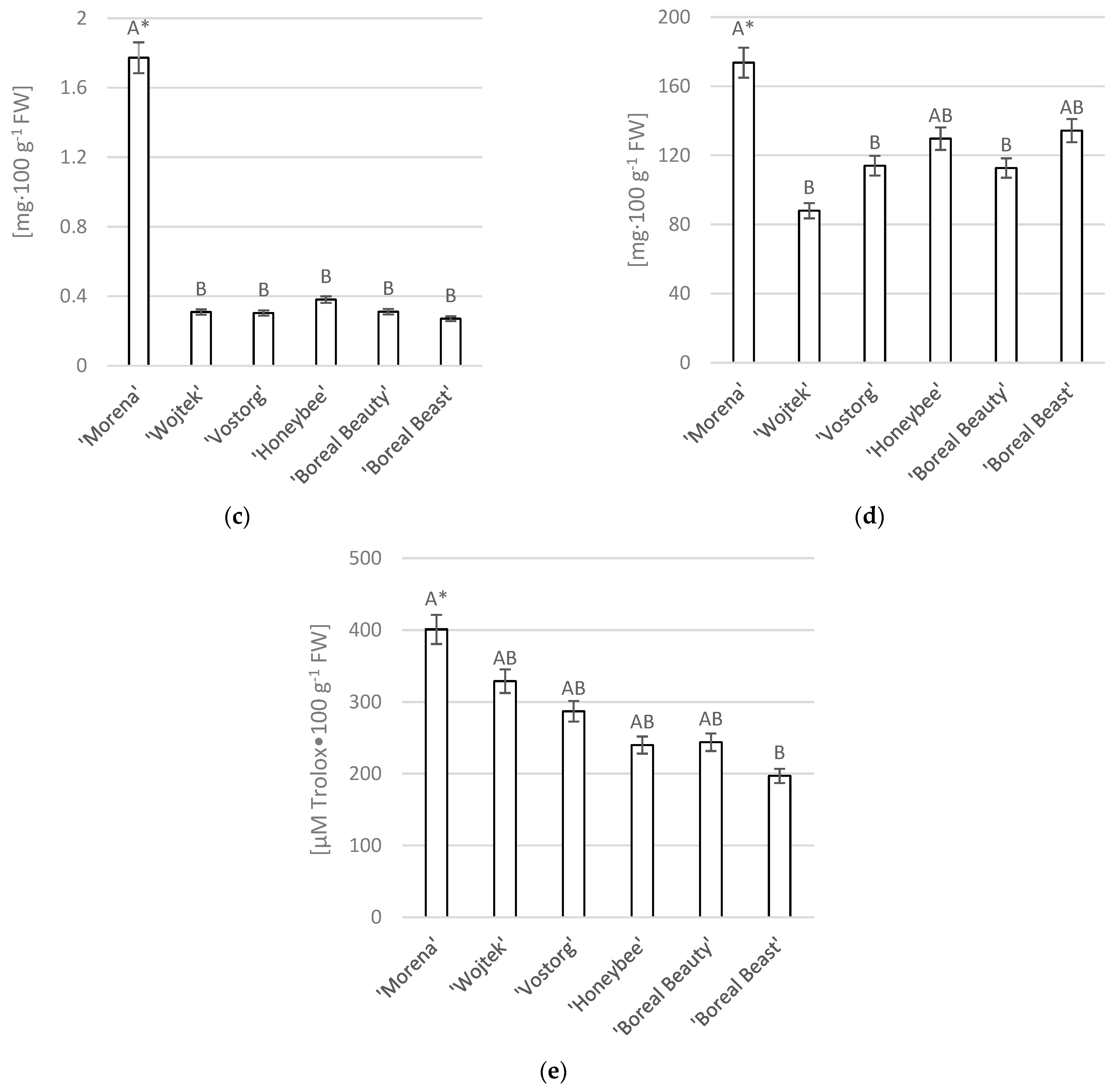 The smallest statistical variation was found in terms of antioxidant activity (Figure 1e). In this case, a significant difference was observed only between the cultivars ‘Morena’ and ‘Boreal Beast’, with antioxidant activity values slightly above 400 µM and around 200 µM Trolox·100 g−1 FW, respectively. However, no significant differences were found between the other cultivars tested and the ‘Morena’ or ‘Boreal Beast’. The antioxidant potential of the fruits of the other cultivars ranged from approx. 330 µM Trolox 100 g−1 FW for the cv. ‘Wojtek’ to approximately 240 µM Trolox 100 g−1 FW for the cv. ‘Honeybee’. It should be emphasized that the antioxidant activity of the ‘Honeybee’, whose fruits had a relatively high content of biologically active compounds, was one of the lowest among the tested cultivars.
