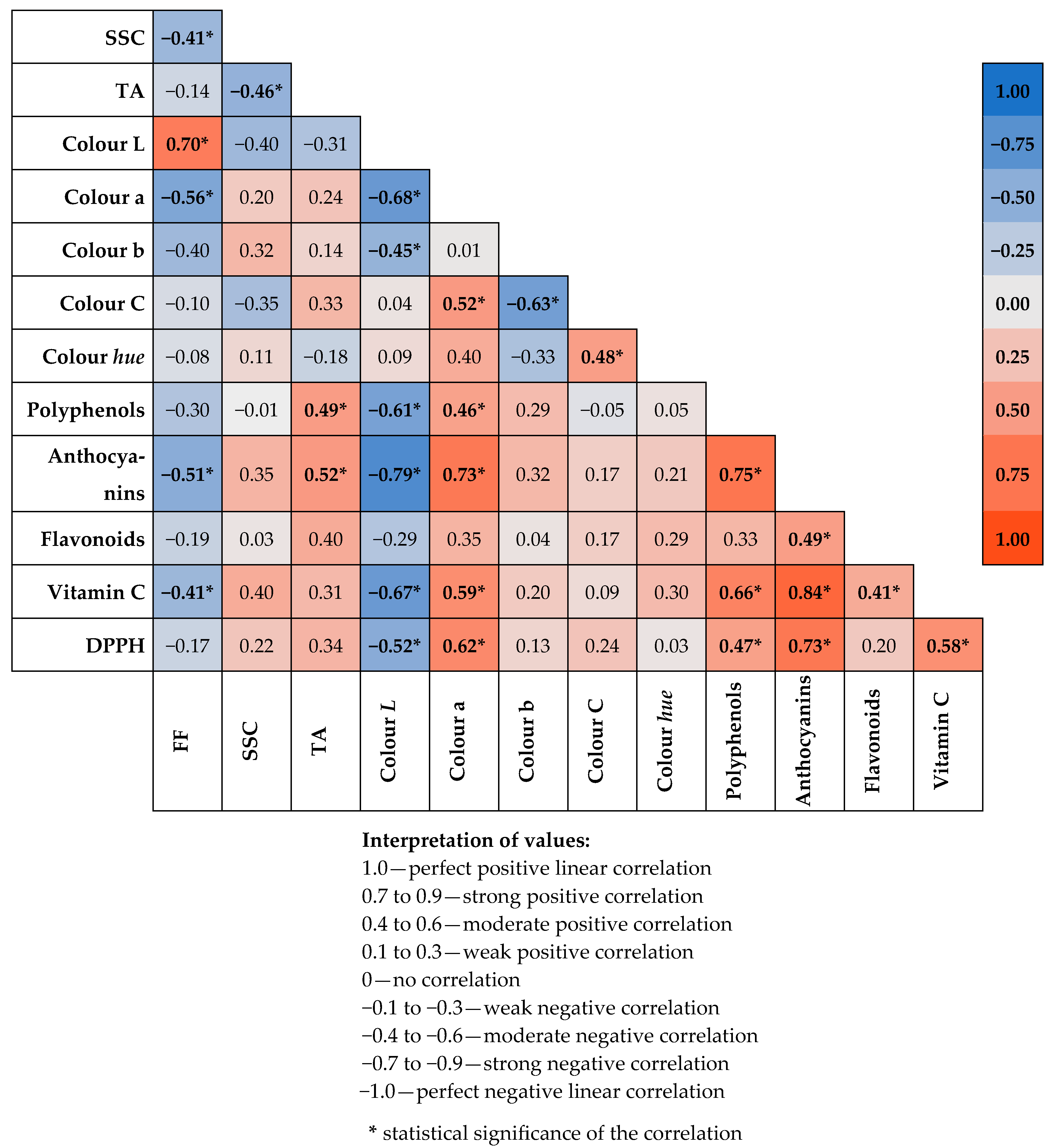 In fruits, the vitamin C content showed a significant negative correlation with the colour brightness parameter (Colour L) (r = −0.67, p < 0.001), which might suggest that darker fruits contained more vitamin C (Figure 2). Furthermore, a moderate positive correlation was found between vitamin C and the Colour a parameter (r = 0.59, p < 0.01), suggesting a possible relationship between the intensity of the red colouring and the content of ascorbic acid. Relatively strong positive correlations were also observed between anthocyanin content and the total content of polyphenols, vitamin C, and flavonoids, as well as antioxidant activity (DPPH). The firmness parameter (FF) was significantly correlated with lightness—Colour L (r = 0.70, p < 0.001). A negative correlation between firmness and Colour a was also confirmed (r = −0.56, p < 0.01). For some parameters, i.e., SSC or colour hue, barely any significant correlations with the other characteristics were found. In these cases, the values of the correlation coefficient ranged below r < 0.3, which indicated a weak or no relationship.