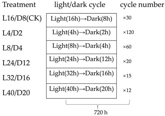 Irradiation patterns during a 720 h growth cycle under different treatments. L16/D8: 16 h of light/8 h of darkness (as the control group), L4/D2: 4 h of light/2 h of darkness, L8/D4: 8 h of light/42 h of darkness, L24/D12: 24 h of light/12 h of darkness, L32/D16: 32 h of light/16 h of darkness, L40/D20: 40 h of light/20 h of darkness. Each treatment group underwent 30, 120, 60, 20, 15, and 12 light–dark cycles during the growth cycle. The arrow indicates that light processing has ended and dark processing will begin.