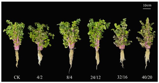 After 30 d of treatment, five healthy leaves were randomly selected, repeated three times, and the net photosynthetic rate (Pn), intercellular CO2 concentration (Ci), transpiration rate (Tr), and stomatal conductance (Gs) were measured using a portable photosynthesis analyzer (LI-COR 6800, Lincoln, NE, USA). Measurements were conducted between 9:00 and 12:00 h. During measurements, CO2 concentration was maintained at 400 μmol·mol−1 using a CO2 cylinder, under controlled conditions of 25 °C, 50% relative humidity, and a photosynthetic photon flux density (PPFD) of 400 μmol·m−2·s−1.