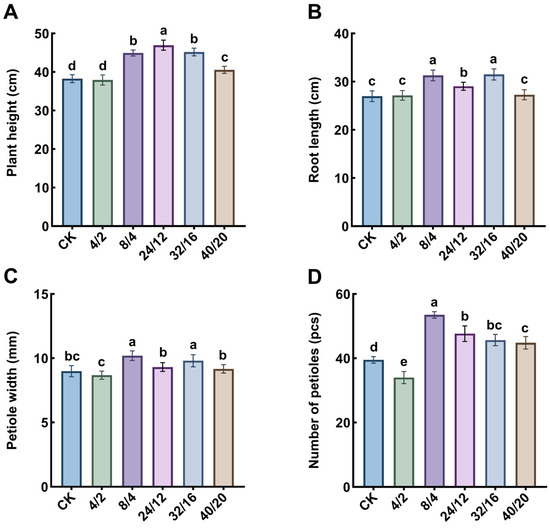 Effects of different light–dark cycles on the growth indicators of celery. (A) plant height, (B) root length, (C) petiole width, (D) number of petioles. Distinct letters placed above the bars denote statistically significant differences (p < 0.05) as assessed by one-way ANOVA followed by Duncan’s multiple range test.