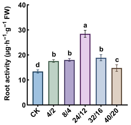 Effects of different light–dark cycles on the root activity of celery. Distinct letters placed above the bars denote statistically significant differences (p < 0.05) as assessed by one-way ANOVA followed by Duncan’s multiple range test.