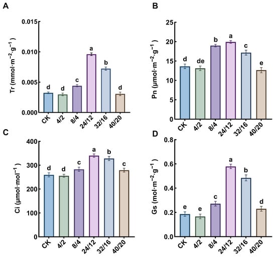 Effects of different light–dark cycles on photosynthetic parameters of celery. (A) Tr, (B) Pn, (C) Ci, (D) Gs. Data are presented as mean ± SD (n ≥ 3). Distinct letters placed above the bars denote statistically significant differences (p < 0.05) as assessed by one-way ANOVA followed by Duncan’s multiple range test.