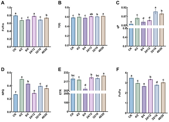 Effects of different light–dark cycles on chlorophyll fluorescence parameters of celery. (A) Fv/Fm, (B) Y(II), (C) qP, (D) NPQ, (E) ETR, (F) Fv/Fo. Distinct letters placed above the bars denote statistically significant differences (p < 0.05) as assessed by one-way ANOVA followed by Duncan’s multiple range test.