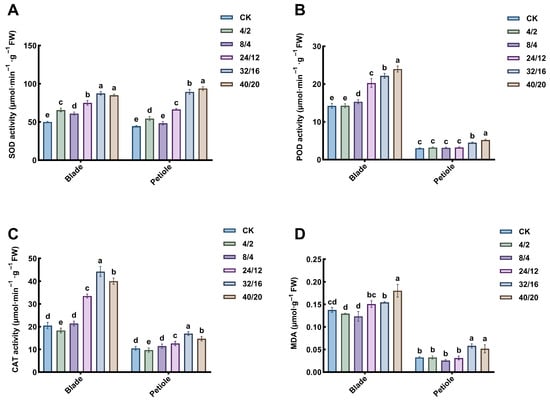 Effects of different light–dark cycles on antioxidant enzymes and MDA content in celery. (A) SOD, (B) POD, (C) CAT, (D) MDA. Distinct letters placed above the bars denote statistically significant differences (p < 0.05) as assessed by one-way ANOVA followed by Duncan’s multiple range test.